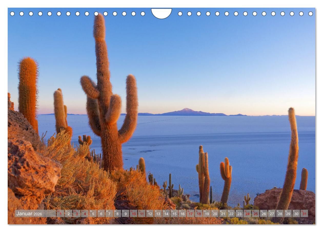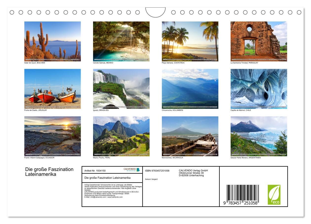 Dieser Kalender präsentiert authentische Fotografien aus Lateinamerika und entführt Sie Monat für Monat in ein anderes Land. Jedes Blatt zeigt beeindruckende Landschaften und Naturschönheiten von den Cenoten Mexikos im Norden bis zu den Gletschern von Argentin...