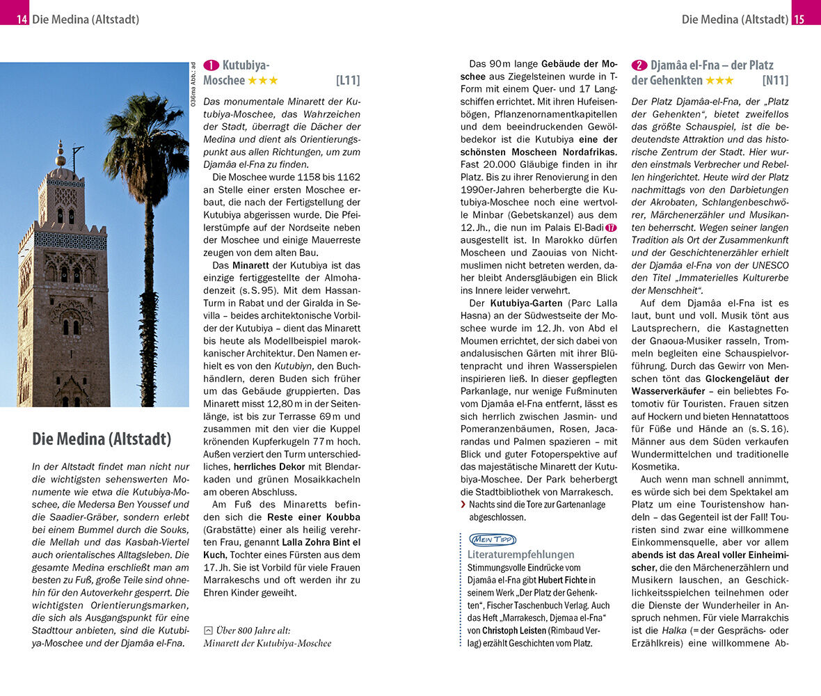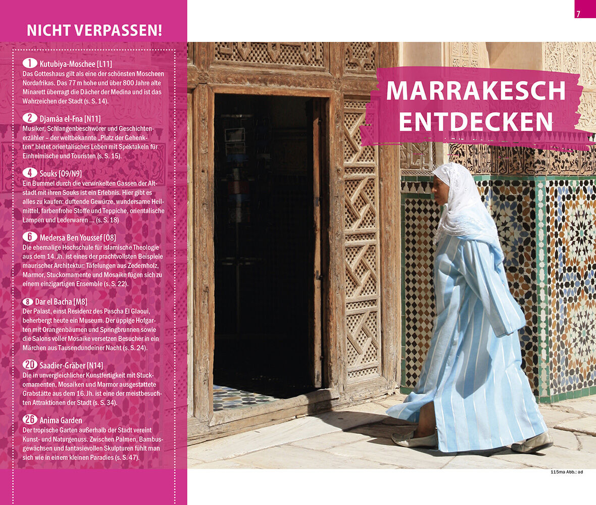 Marrakesch, die sagenhafte Rote Stadt, verkörpert den Zauber Marokkos. Im Gassenlabyrinth der Medina, umgeben von einer ockerroten Stadtmauer mit mächtigen Toren, bieten Händler bunte Stoffe, Gewürze und Schmuck feil. Prächtige maurische Paläste und Moscheen ...