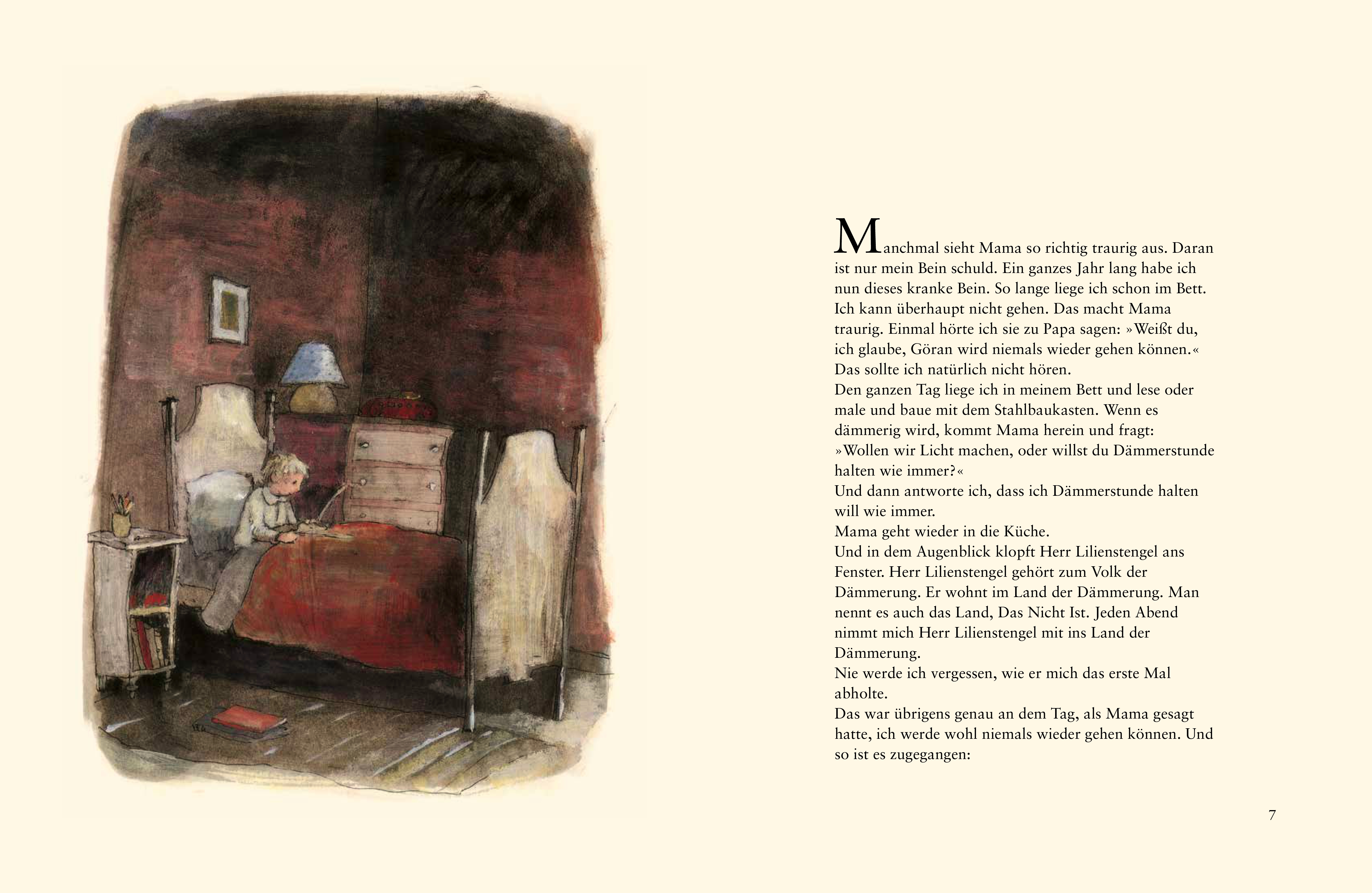 Eines Abends geschieht ein Wunder: Ein kleiner Herr in einem karierten Anzug kommt in Görans Kinderzimmer. Herr Lilienstengel nimmt Göran, der seit einem Jahr krank im Bett liegt, mit auf eine zauberhafte Reise. Denn im Land der Dämmerung ist alles anders und...