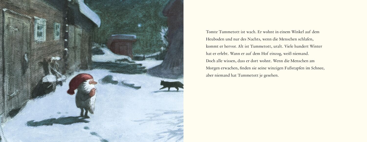 Ein einzigartiger Wichtel Wenn die Sterne am Himmel funkeln und der Schnee weiß leuchtet, schleicht auf leisen Sohlen Tomte Tummetott, der Wichtel mit der roten Mütze, im Mondlicht umher und hinterlässt winzige Fußstapfen. Er bewacht die schlafenden Menschen ...
