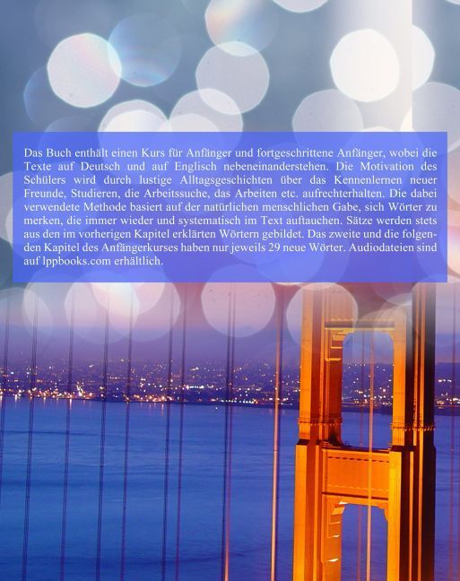 Das Buch enthält einen Kurs für Anfänger und fortgeschrittene Anfänger, wobei die Texte auf Deutsch und auf Englisch nebeneinanderstehen. Die Motivation des Schülers wird durch lustige Alltagsgeschichten über das Kennenlernen neuer Freunde, Studieren, die Arb...