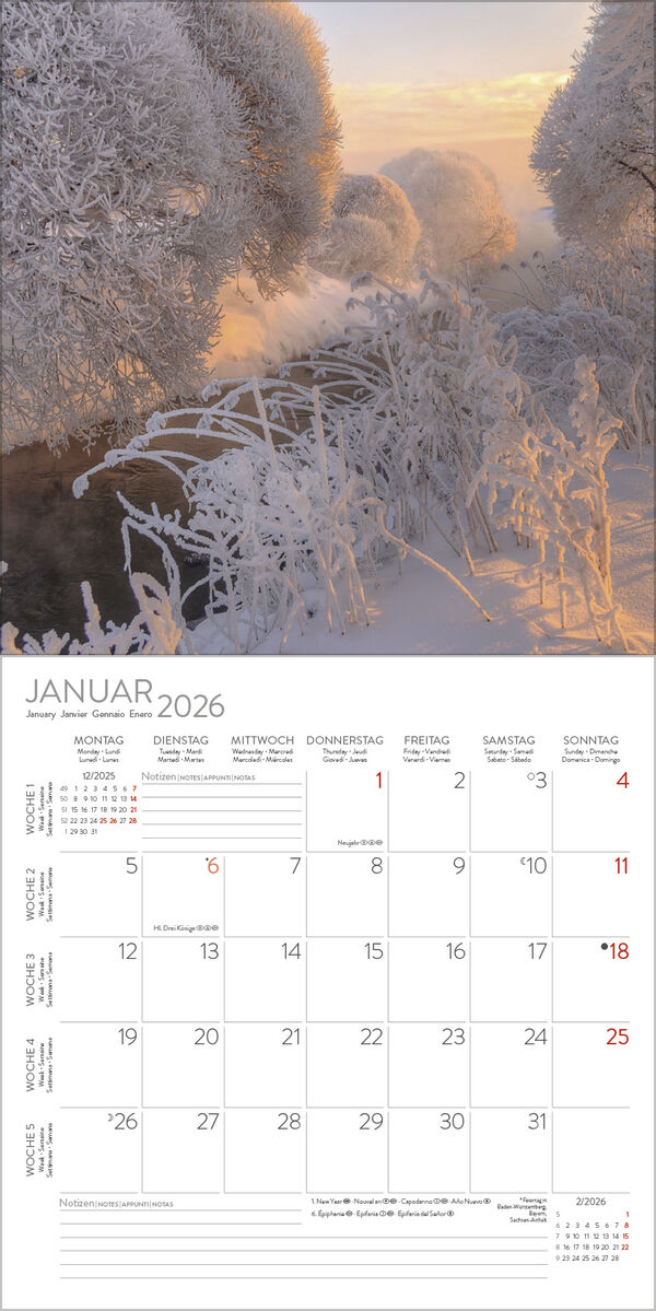 Produktmerkmale Wandkalender im Format: 30 x 30 cm; Offenes Format: 30 x 60 cm; umweltfreundliches FSC Papier Jede Kalenderseite mit großem Bild und viel Platz im Kalendarium für Notizen und Termine Mehrsprachiges Kalendarium: DE/GB/FR/IT/ES mit Feiertagen für...