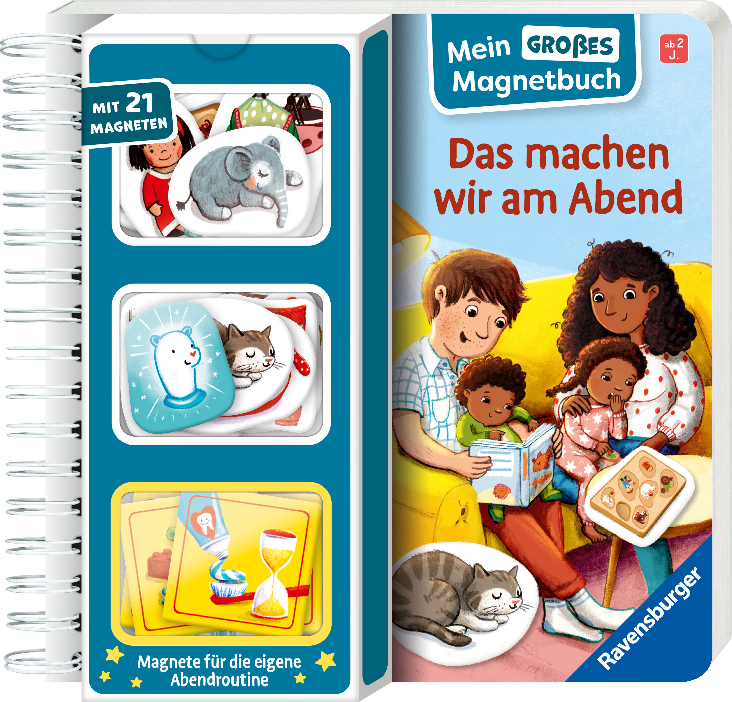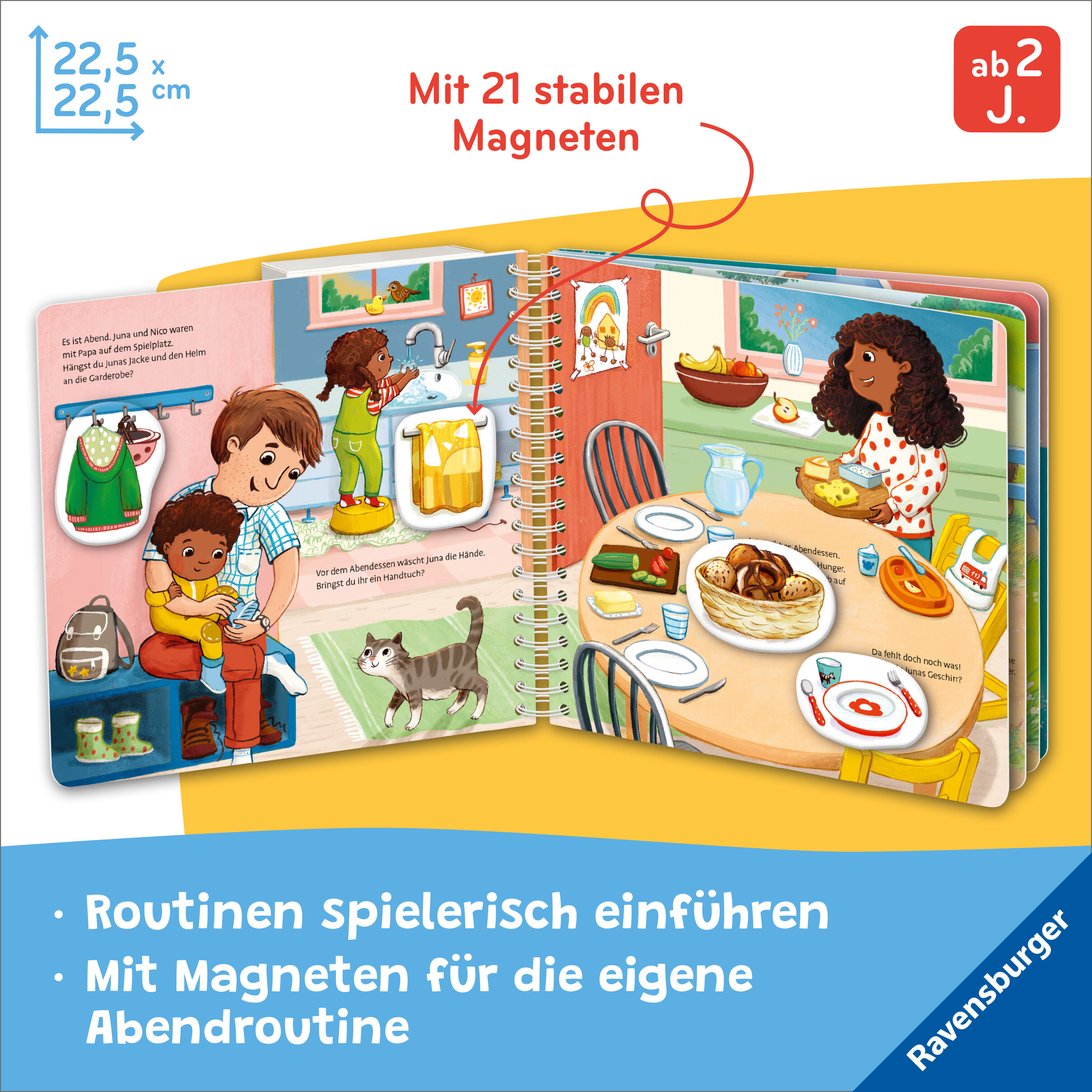 Die Abendroutine spielerisch einführen Es ist Abend. Juna und Nico kommen gerade nach Hause. Nun ist es Zeit zum Händewaschen und Tischdecken. Später wollen sie sich bettfertig machen. Dank der Magnete können Kleinkinder hier mithelfen und Juna und Nico das Ha...