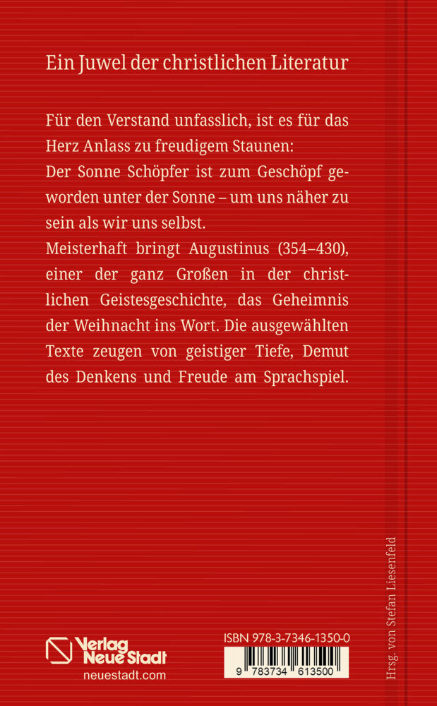Vom Geheimnis der Weihnacht Weihnachtsgedanken des großen Kirchenlehrers Meisterhaft formulierte Betrachtungen zum Geheimnis der Menschwerdung Gottes. Für den Verstand unfasslich, ist es für das Herz Anlass zu freudigem Staunen. Die Weise, wie Augustinus das U...