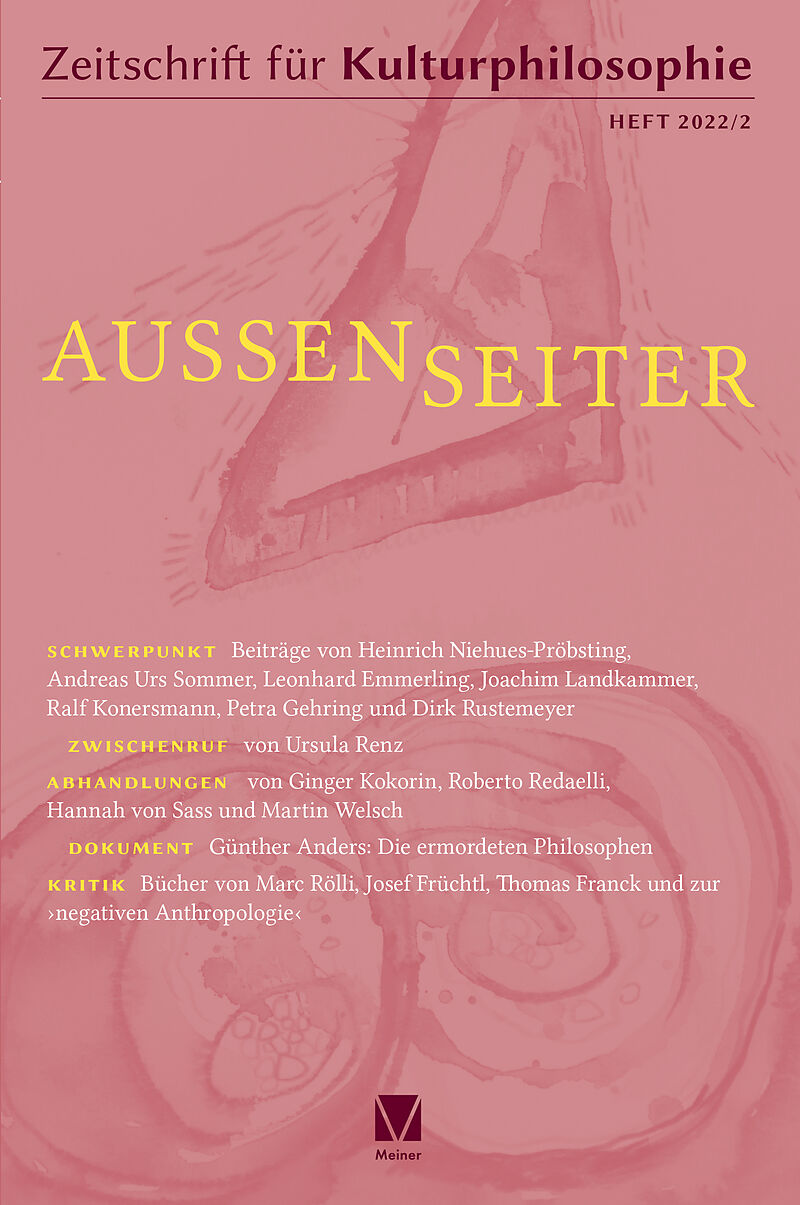 Abstracts Becker, Ralf, Bermes, Christian, Westerkamp, Dirk: Editorial. Rustemeyer, Dirk: Einleitung zum Schwerpunkt. Niehues-Pröbsting, Heinrich: Sophisten. The Sophists owe their place in the history of philosophy to Plato but also their bad reputation. He u...Abstracts Becker, Ralf, Bermes, Christian, Westerkamp, Dirk: Editorial. Rustemeyer, Dirk: Einleitung zum Schwerpunkt. Niehues-Pröbsting, Heinrich: Sophisten. The Sophists owe their place in the history of philosophy to Plato but also their bad reputation. He uses them to profile his image of the philosopher against them. For him, sophistry is the ultimate in distance from philosophy while at the same time being close to philosophy; it is as related to this »as the wolf is to the dog«. I first trace the negative exaggeration of sophistry and the sophists in Plato, which is reflected in the ineradicable negative connotation of »sophist« and »sophistic«. The great intellectual-historical importance of the Sophists does not lie primarily in what they independently contributed to philosophy, but in the establishment of a conception of rhetoric as we encounter it in Isocrates, which became the most important educational institution in antiquity alongside and before philosophy. Sommer, Andreas Urs: Der Philosoph als Außenseiter und als Selbstbefreiungsheld. Der Fall Nietzsche(s) The article deals with the question of the extent to which Friedrich Nietzsche tried out various roles of being an outsider as well as the extent to which he also wanted to be an insider again and again. Special emphasis is placed on the problem of »historical philosophizing«, to which Nietzsche committed himself in 1878. Emmerling, Leonhard: Die Erfindung des Außenseiters. Eine sehr kurze Geschichte Using the art-brut theory by Jean Dubuffet as a starting point, the text aims to give profile to the changes, the figure of the outsider has experienced since the collapse of the category of the avant-garde. Under the auspices of cognitive capitalism and with the help of social media, the concept of outsiderness has transformed itself from a figure of authenticity and resistance against oppressive social circumstances to the realization of the unmediated, tactless, and brutal universalization of particularities. Landkammer, Joachim: Bratschen gegen das Ego . Der Dilettant als Außenseiter The text tries to base a theory of dilettantism on the definition of the dilettante as an insufficiently skilled underperformer who is well-aware of his shortcomings. Various measures designed to undermine the difference between professionals and dilettantes do not alter the fundamental distinction. Catherine Drinker Bowen's »Friends and Fiddlers« (1935) is read as a moralizing self-testimony of musical amateurism that celebrates community and humility, against the imputed selfishness of the virtuoso. Konersmann, Ralf: Der Außenseiter als Gestalt. The outsider as a phenomenon belongs to the realm of the social world. Nevertheless, the concept of outsiderness is also of interest from a cultural philosophical point of view, namely in two respects: First, a certain form of acquisitive thinking seems to have contributed to its emergence: the distinction between mine and yours. Secondly, in the conventional, purely functional view, the outsider himself is missing, i. e., the outsider as a figure. Gehring, Petra: Ohne Rand . Mutmaßungen über eine nachlassende Begriffskonjunktur The essay examines the topology associated with the figurative semantics of the »outsider« it is one of boundaries and exclusion or even exclusion. However, after a period of booming use of the pejorative term »outsider« (as well as the positively connoted figure of the »dropout«) in social philosophy, the use of these terms is waning. Likewise, the associated idea of the social as a large and homogeneous »interior (space)« seems to be fading. Socio-philosophical topologies of the present time have become more complex so the author's thesis. Perhaps our models of the social are even no topologies at all, namely no more spatial figures. Rustemeyer, Dirk: Ikonik des Terrors. Renz, Ursula: Unsere Identität ist nicht, womit wir uns identifizieren . Zu einer begrifflichen Unterscheidung und ihren mannigfachen Implikationen Redaelli, Roberto: Heinrich Rickert. Zu einer axiologischen Anthropologie von Sass, Hannah: Die liebe Verwandtschaft? . Über ökoethische Narrative der Entgrenzung Welsch, Martin: Scheitern und Verstehen? . Zum »Forgotten Kind of Writing«-Ansatz der Erforschung philosophischer Rhetorik Anders, Günther: Die ermordeten Philosophen. Gespräch (1944) Oberschlick, Gerhard: Editorische Bemerkungen zum Dokument Zu Günther Anders' Die ermordeten Philosophen. Gespräch. Kritik. Marc Rölli, Anthropologie dekolonisieren, Frankfurt a. M.: Campus 2021. Daniel Martin Feige, Die Natur des Menschen. Eine dialektische Anthropologie, Berlin: Suhrkamp 2022. Josef Früchtl, Demokratie der Gefühle. Ein ästhetisches Plädoyer, Hamburg: Meiner 2021. Hannes Bajohr / Sebastian Edinger (Hrsg.), Negative Anthropologie. Ideengeschichte und Systematik einer unausgeschöpften Denkfigur, Berlin/Boston: de Gruyter 2021. Thomas Franck, Adorno en France. La constellation Arguments comme dialogue critique, Rennes: PUR 2022.