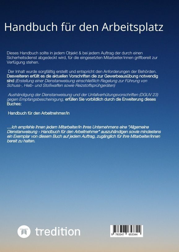 Dieses Handbuch sollte in jedem Objekt & bei jedem Auftrag der durch einen Sicherheitsdienst abgedeckt wird, für die eingesetzten Mitarbeiter/innen griffbereit zur Verfügung stehen. Der Inhalt wurde sorgfälltig erstellt und entspricht den Anforderungen der...