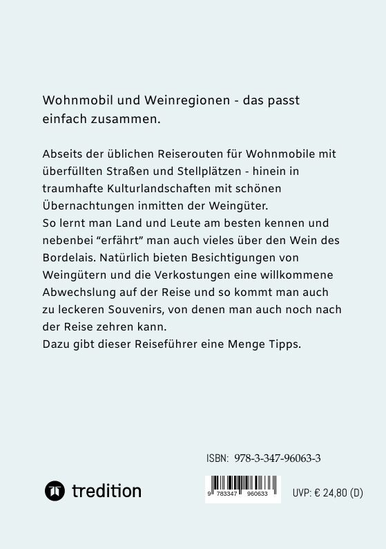 Mit dem Wohnmobil die Weinregion Bordeaux "erfahren" - abseits der vollen Touristenrouten und vollen Stellplätze. Neben den ausgesuchten Routen zu bekannten Chateaus und Weinbergen gibt es auch eine Menge Wissen rund um den Bordeaux-Wein sowie seinen Winzern. ...