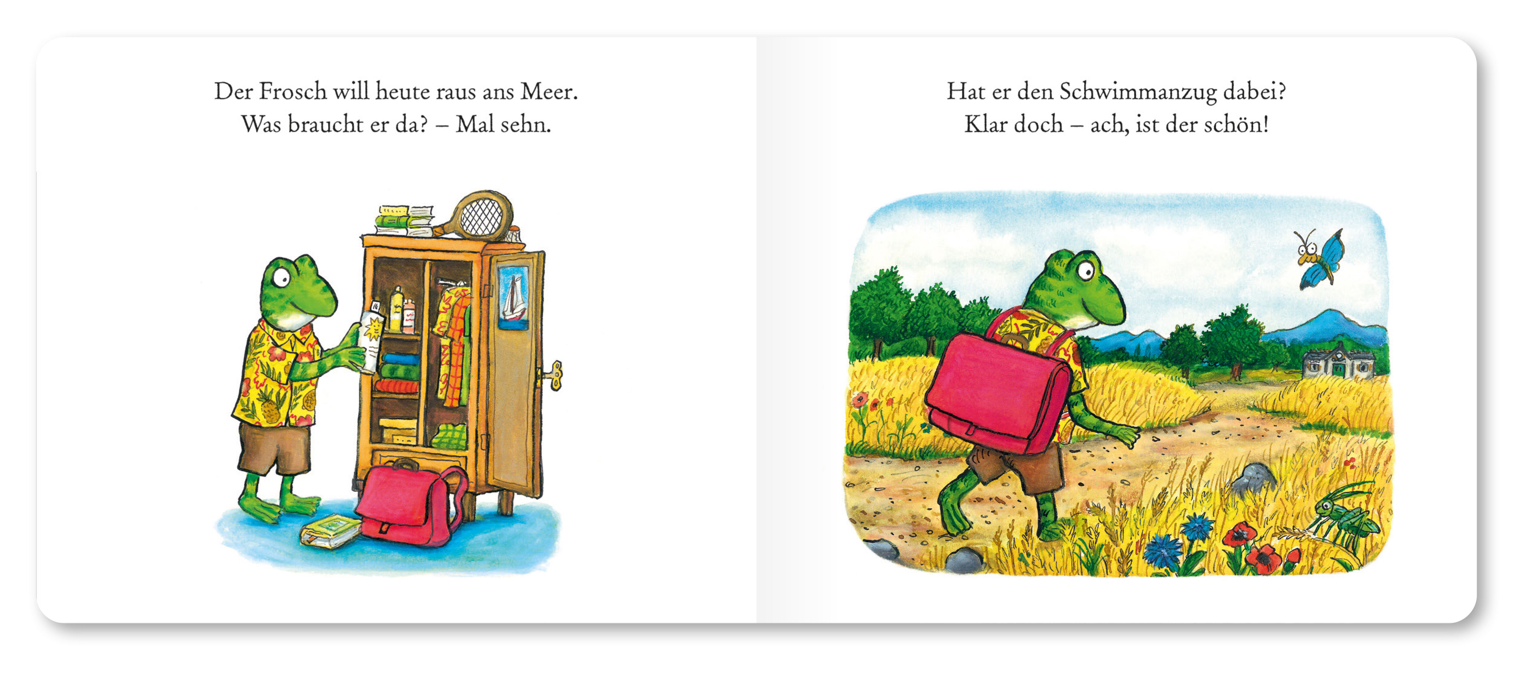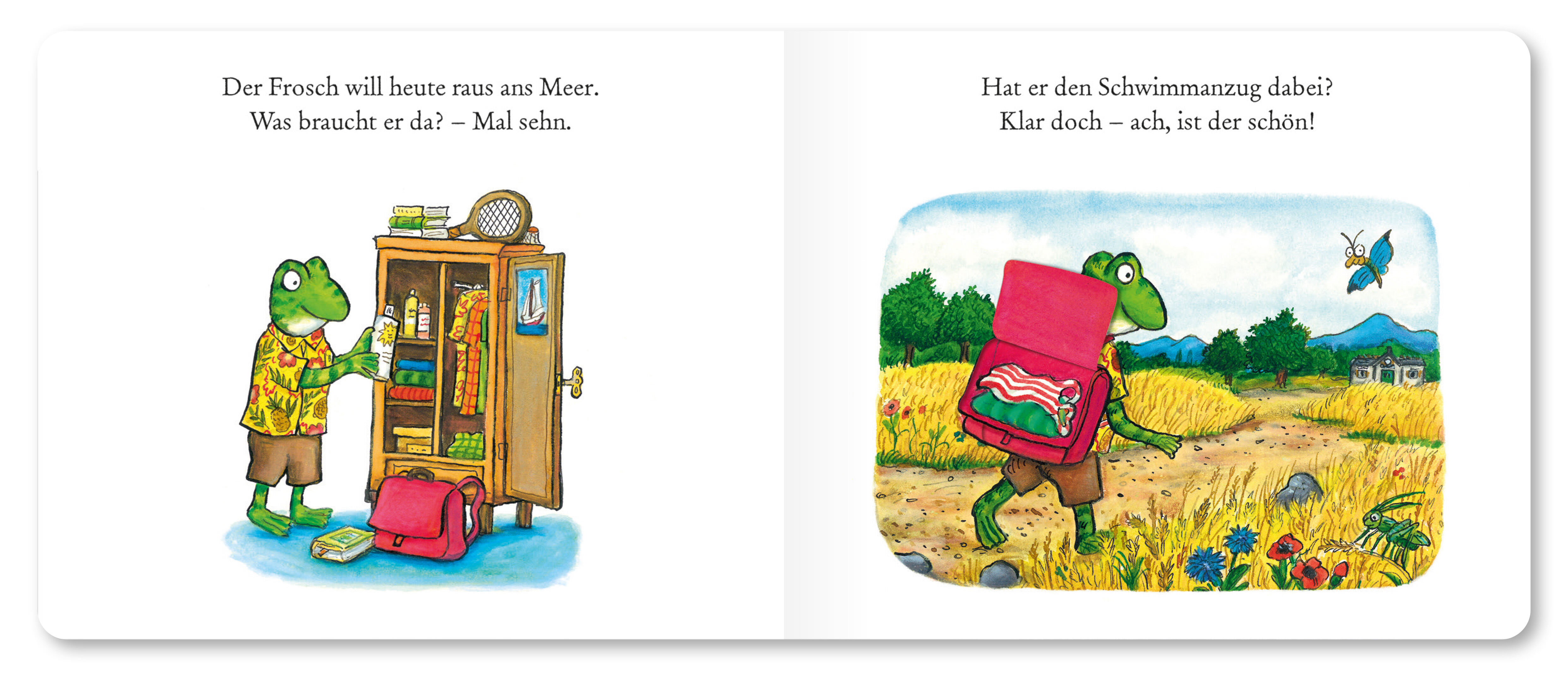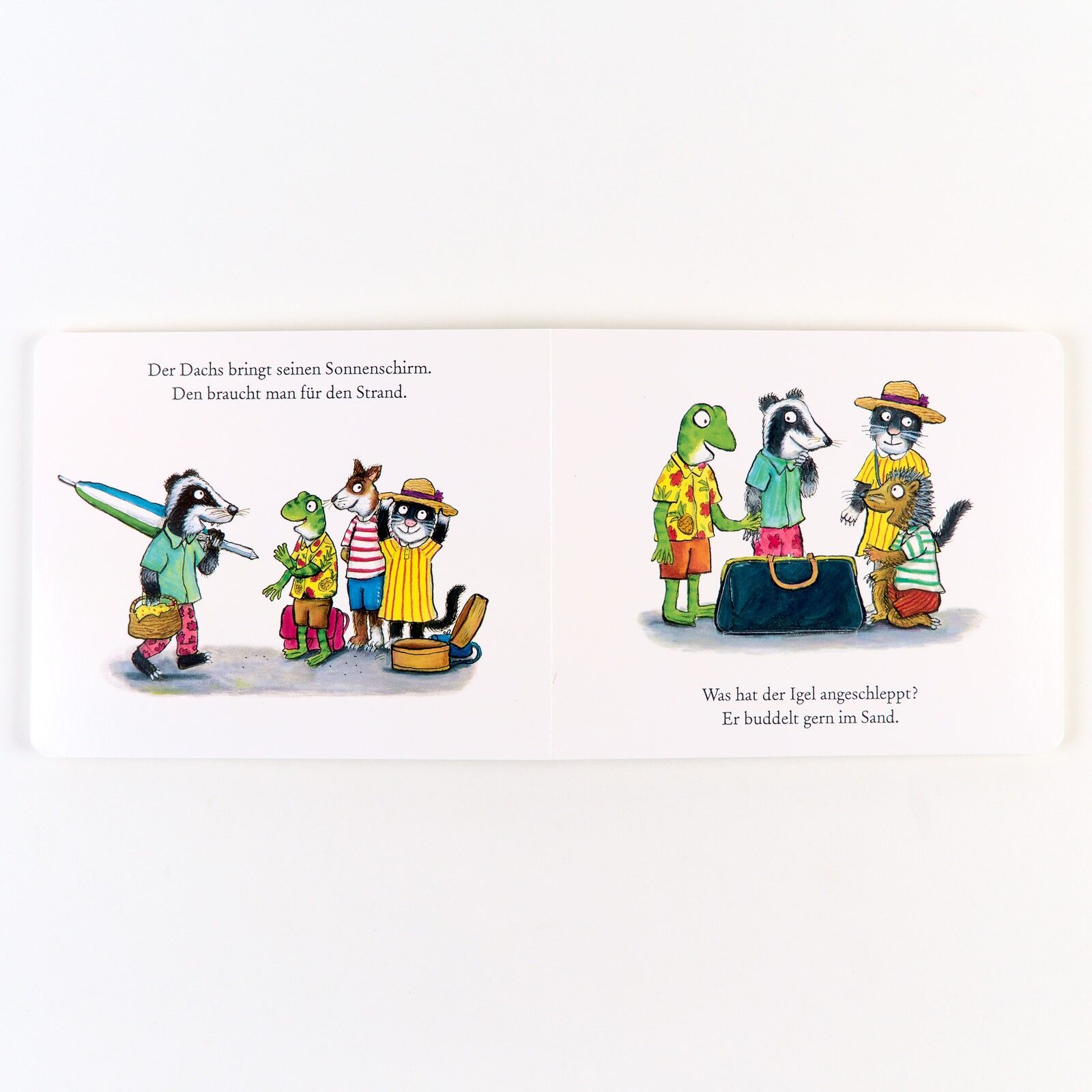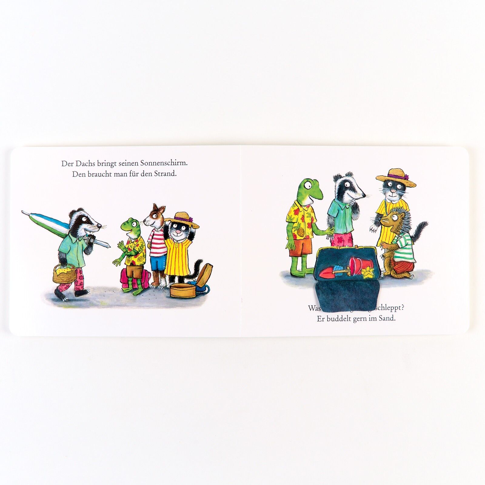 Der Frosch will heute ans Meer und alle seine Freunde kommen mit. Der Dachs packt den Sonnenschirm ein, die Katze ihren Ball. Und was schleppt der Igel mit? Wenn man hinter die Klappen guckt, sieht man, was sie zum Spielen alles brauchen. Ein Pappbilderbuch vo...
