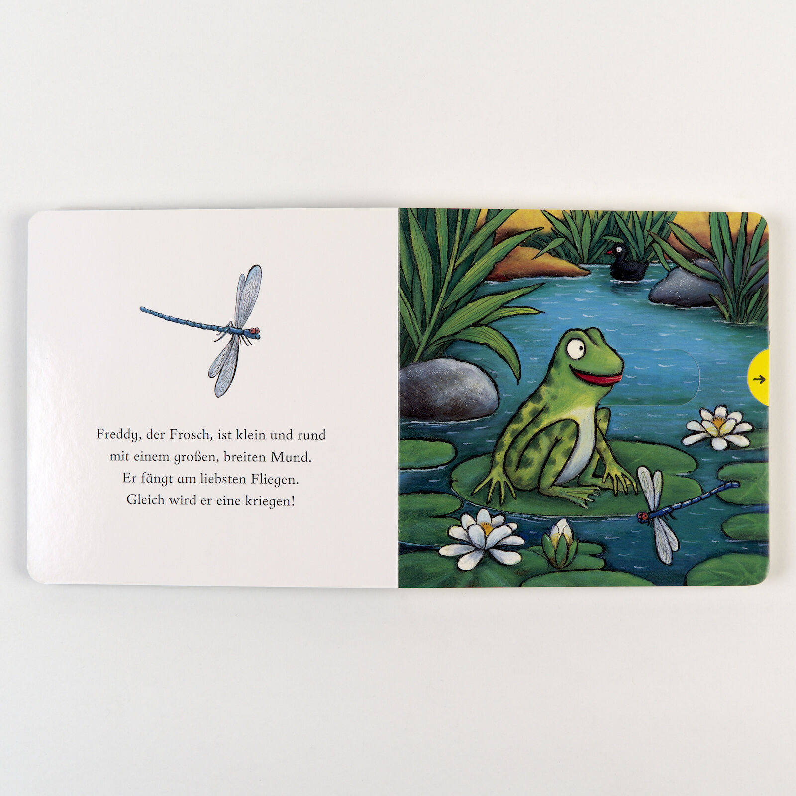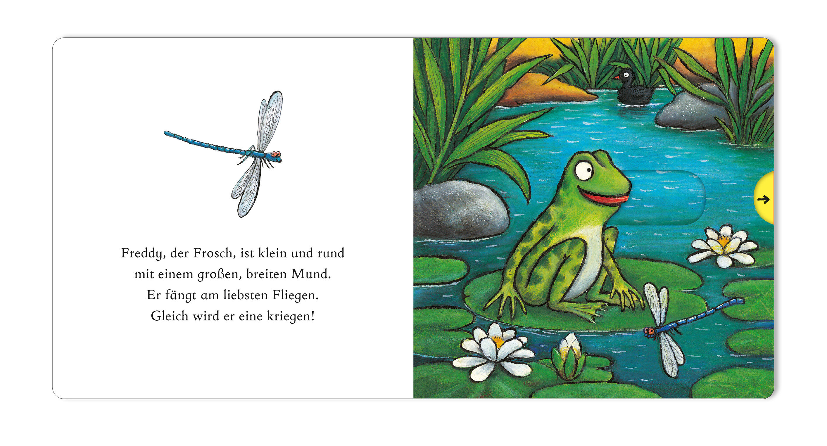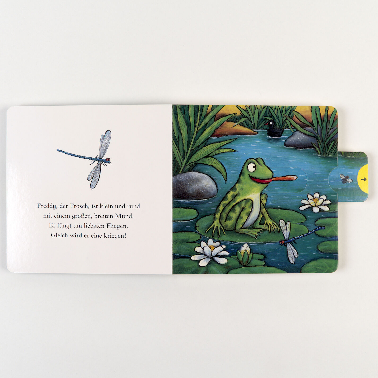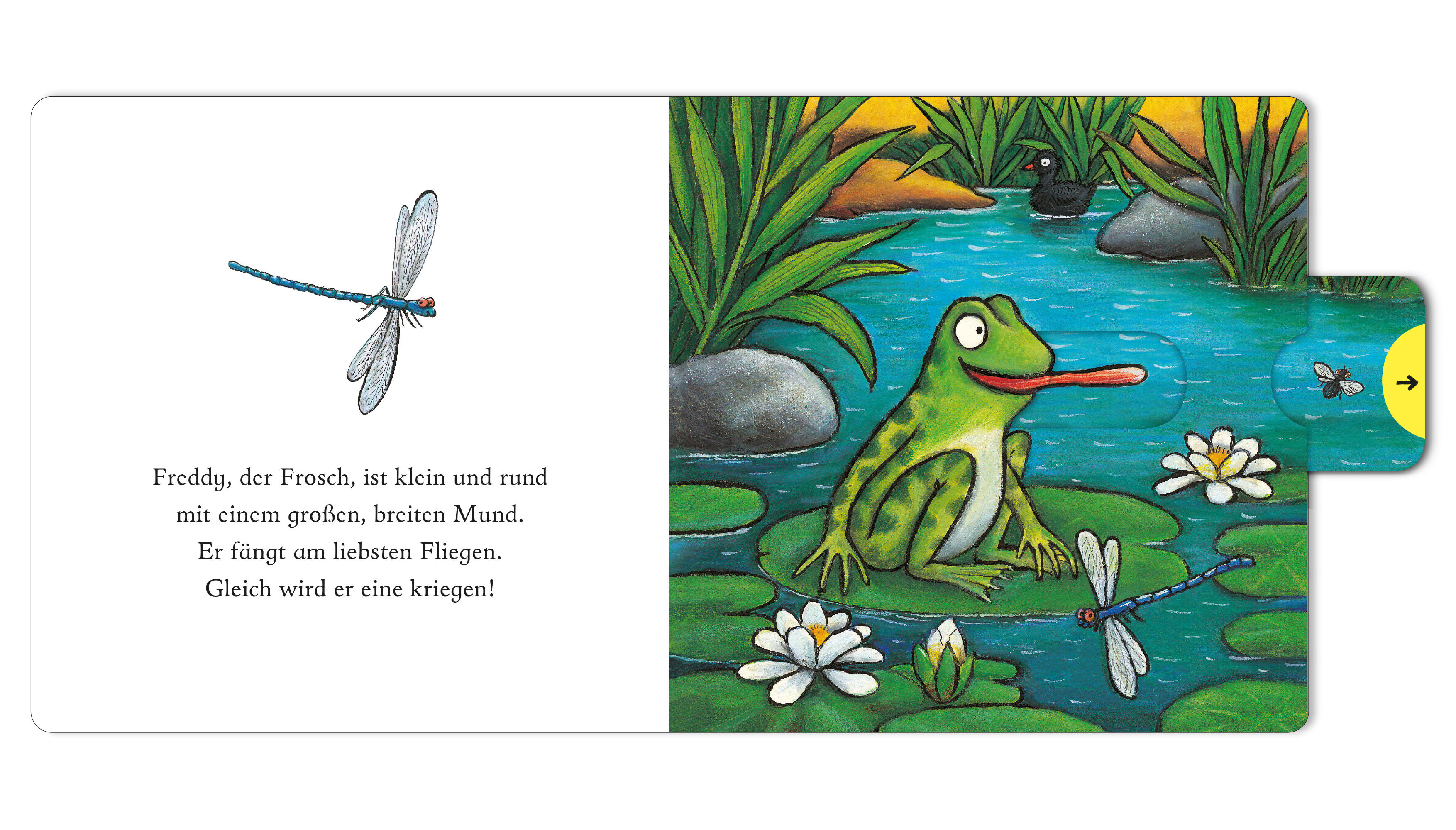 Freddy, der Frosch ist klein und rund mit einem großen, breiten Mund - er fängt am liebsten Fliegen! Ein vergnügtes Pappbilderbuch von dem Illustrator des Grüffelo mit einfachen und lustigen Versen, in denen kleine Kinder mit dem kleinen Frosch singen und quak...