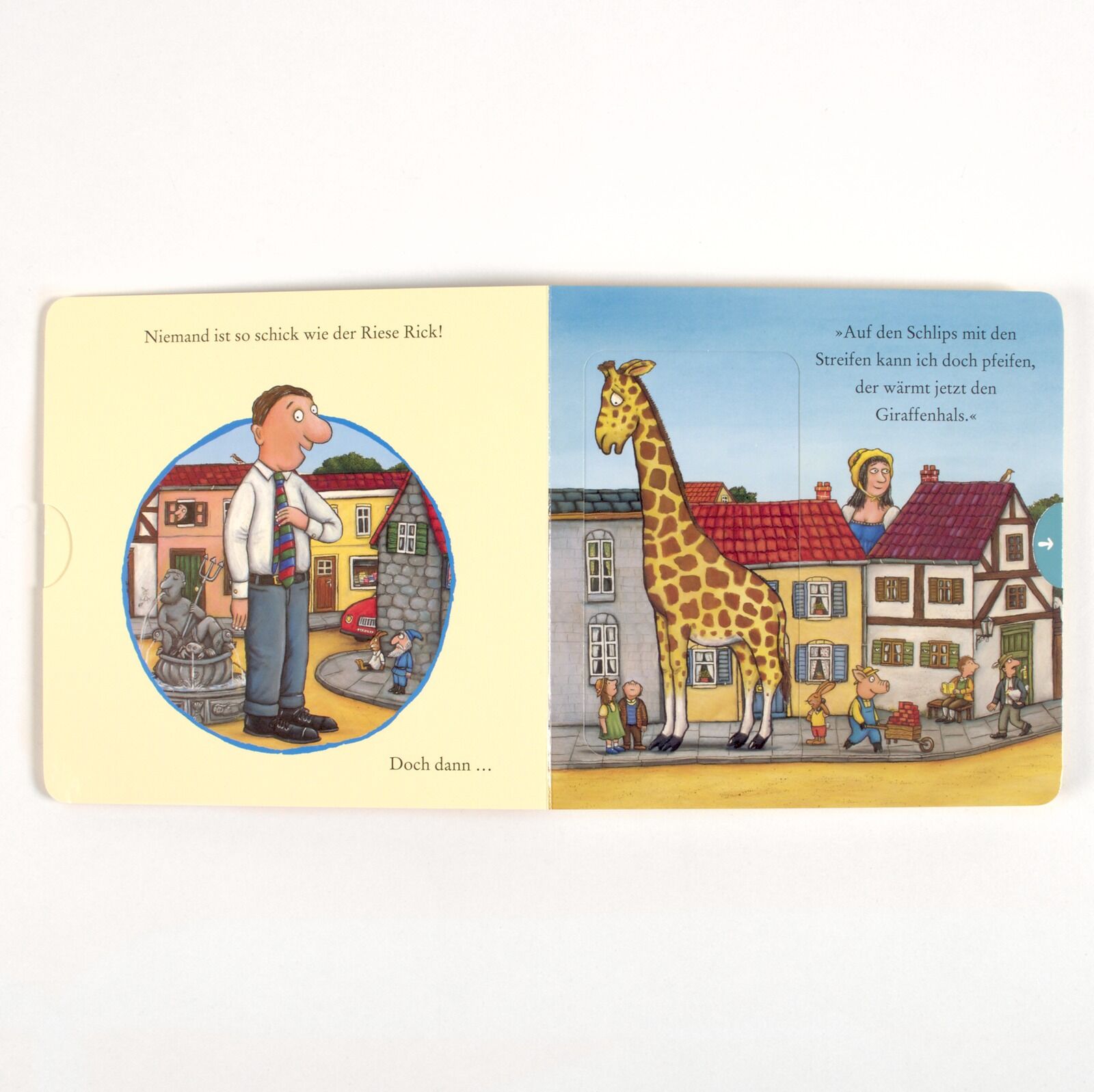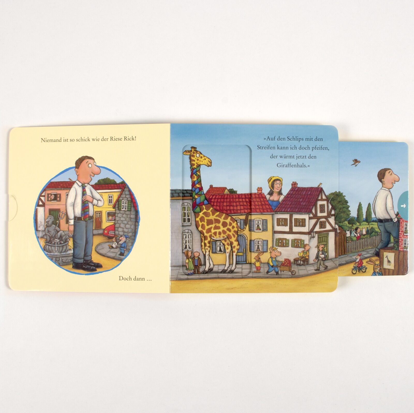 Riese Rick hat sich neu eingekleidet. Aber dann trifft er auf lauter Tiere, die seine Hilfe brauchen und seine Kleider. Die beliebte Geschichte von »Riese Rick macht sich schick« als Spielpappe für alle Kinder ab 2 Jahre. Durch einfaches Schieben und Ziehen de...