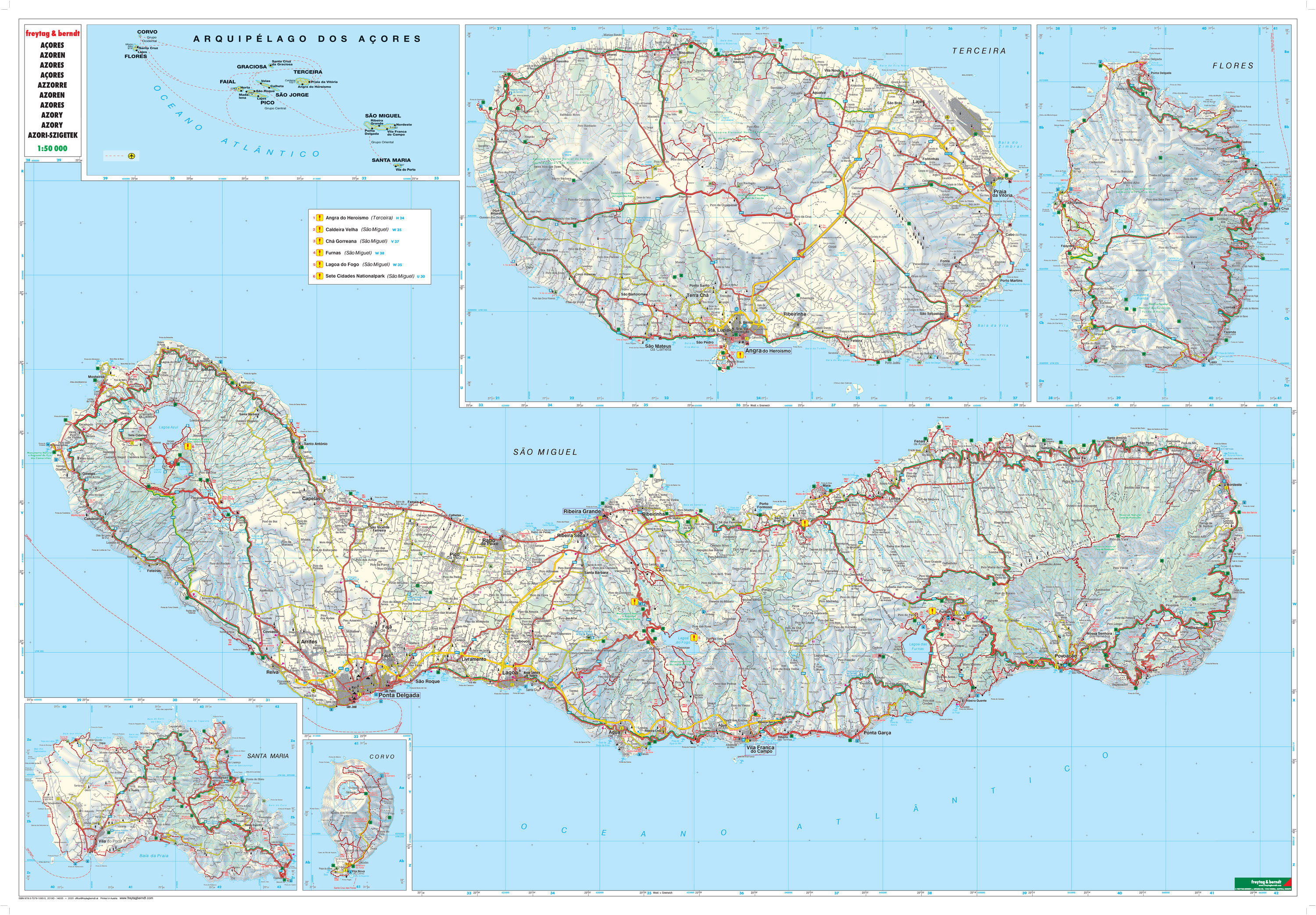 Mit der Straßenkarte Azoren im Maßstab 1:50.000 finden sich Urlauber die mit Auto, Motorrad oder Wohnwagen unterwegs sind bestens zurecht. Das weit verzweigte Straßennetz ist exakt abgebildet, Entfernungen und viele Ausflugsziele sind in der Karte eingezeichne...