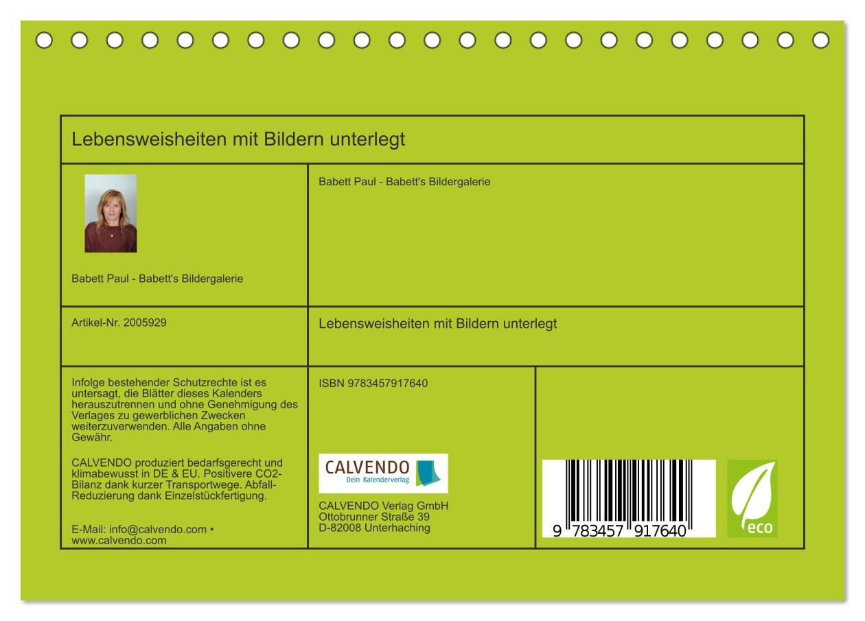Jeder Blick auf den Kalender ein Genuss für die Augen und den Geist. Lebensweisheiten und Zitate mit sinngebenden Bildern, farbenfroh gestaltet.