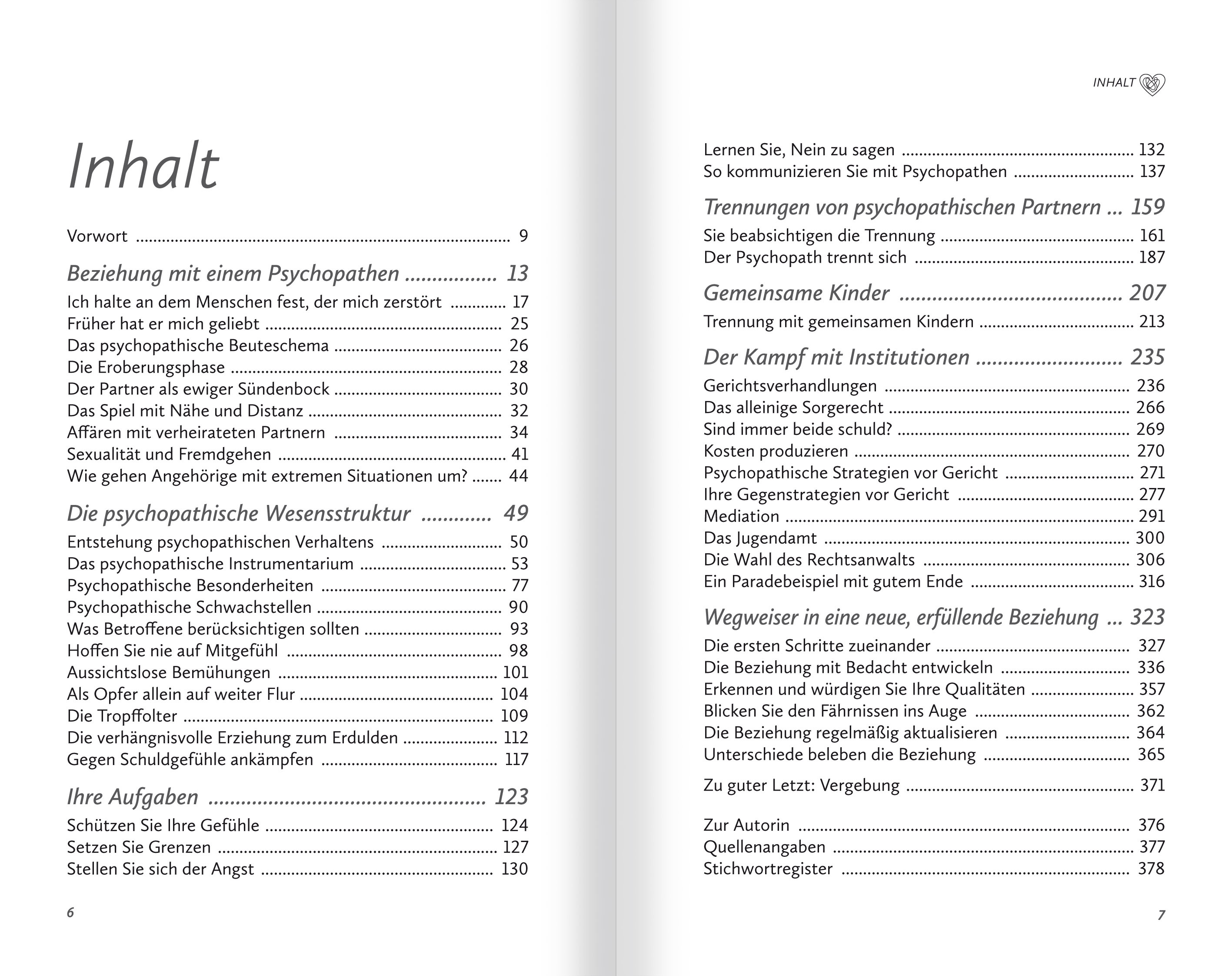 INHALT Vorwort Beziehung mit einem Psychopathen - Ich halte an dem Menschen fest, der mich zerstört - Früher hat er mich geliebt - Das psychopathische Beuteschema - Die Eroberungsphase - Der Partner als ewiger Sündenbock - Das Spiel mit Nähe und Distanz - Affären mit verheirateten Partnern - Sexualität und Fremdgehen - Wie gehen Angehörige mit extremen Situationen um? Die psychopathische Wesensstruktur - Entstehung psychopathischen Verhaltens - Das psychopathische Instrumentarium - Psychopathische Besonderheiten - Psychopathische Schwachstellen - Was Betroffene berücksichtigen sollten - Hoffen Sie nie auf Mitgefühl - Aussichtslose Bemühungen - Als Opfer allein auf weiter Flur - Die Tropffolter - Die verhängnisvolle Erziehung zum Erdulden - Gegen Schuldgefühle ankämpfen Ihre Aufgaben - Schützen Sie Ihre Gefühle - Setzen Sie Grenzen - Stellen Sie sich der Angst - Lernen Sie, Nein zu sagen - So kommunizieren Sie mit Psychopathen Trennungen von psychopathischen Partnern . - Sie beabsichtigen die Tre…