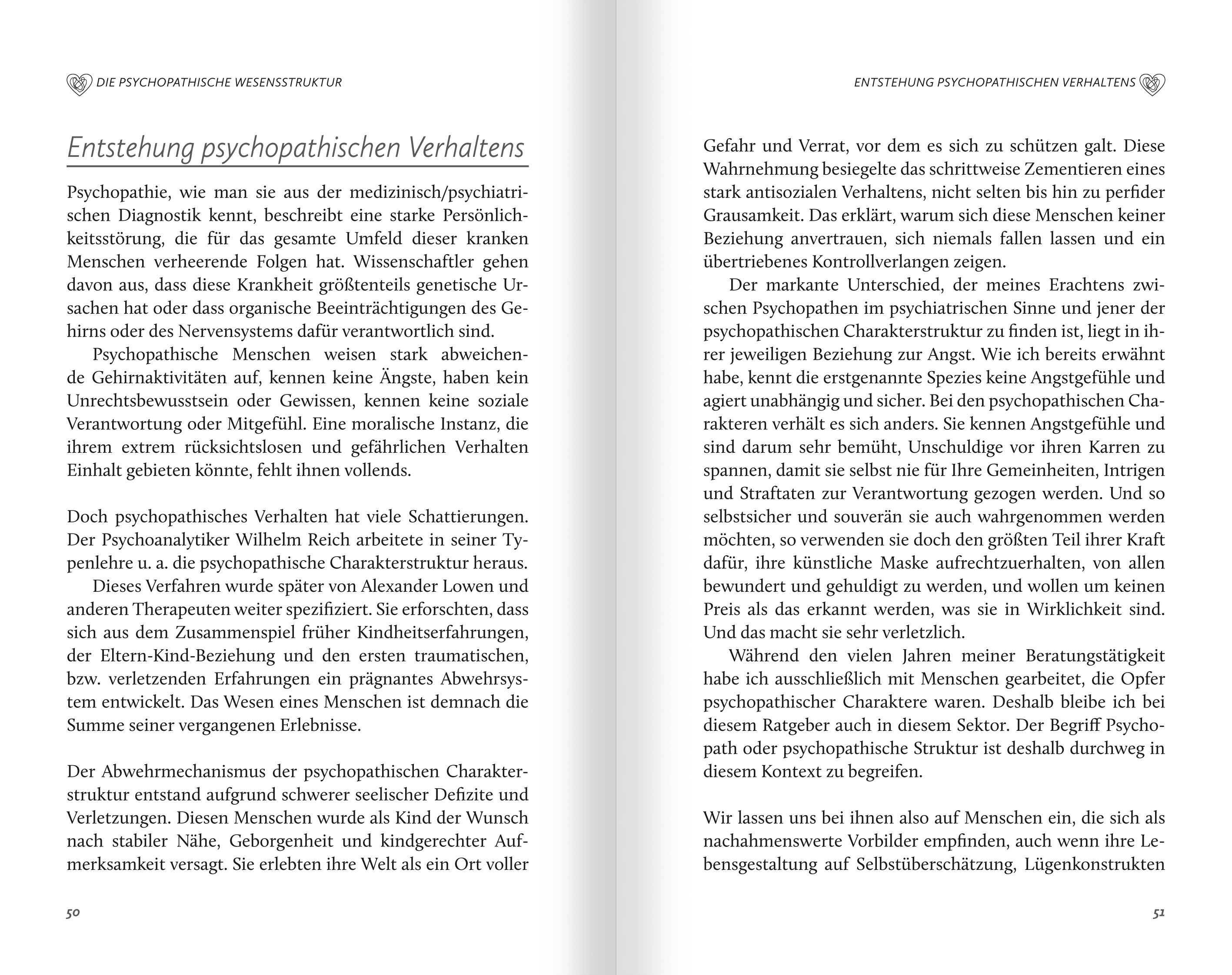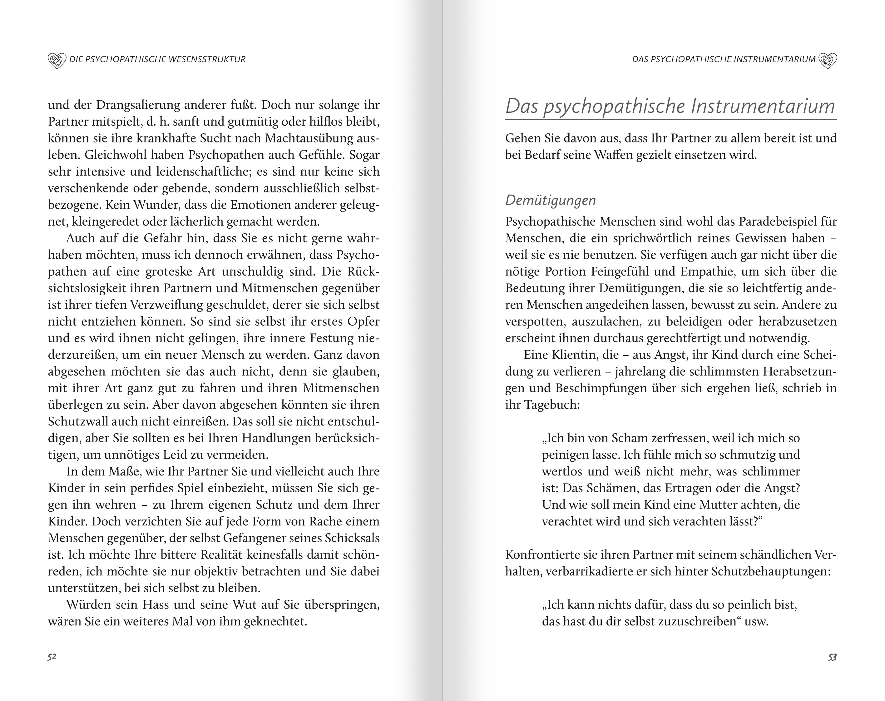 Liebe Leserin, lieber Leser! Dieser Ratgeber ist ein Arbeitsbuch aus der Praxis für die Praxis. Es soll Sie durch die schwere Zeit mit Ihrem Partner/Ex-Partner begleiten: einem Menschen mit einer psychopathischen Struktur, der keine Wertschätzung oder Empathie aufbringt, dem jedwedes Werteverständnis fehlt und der von Rachegedanken und Vernichtungswillen getrieben ist. Die Empfehlungen, die Sie in diesem Buch finden, basieren auf jahrelangen erfolgreichen Beratungen und der Begleitung von Opfern dieser besonderen Spezies. Die vielen Erfahrungen und Fallbeispiele der Betroffenen und die daraus gewonnenen Erkenntnisse und Strategien sollen als Arbeitshypothese dienen und Orientierung schenken. Es geht also nicht darum, diese Menschen herabzusetzen, sondern vielmehr um das Erkennen psychopathischer Merkmale und letztendlich darum, die erforderlichen Handlungskompetenzen zu erhalten. Nehmen Sie sich beim Lesen einen Marker zur Hand und markieren Sie die für Sie relevanten Stellen. Was die empfohlenen Reflexionen betrifft, so empfehle ich, zunächst das ganze Buch zu lesen und sich danach gezielt und intensiv mit ihnen zu beschäftigen. Bedenken Sie beim Lesen, dass psychopathisches Verhalten in vielen Abstufungen auftritt. Ebenso sind auch die Opfer unterschiedlich stark, unterschiedlich mutig und sehr verschieden in ihrer Herangehensweise. Meine Anregungen sind deshalb als Möglichkeiten zu verstehen, von denen in Abhängigkeit der persönlichen Umstände abgewichen werden kann. Meine Klienten sind überwiegend Frauen, was sich im Inhalt dieses Buchs widerspiegelt. Das mag daran liegen, dass psychopathisches Verhalten vorwiegend bei Männern auftritt. Möglicherweise sind aber auch Frauen viel eher bereit, in Konfliktsituationen Hilfe zu suchen und sich beraten zu lassen. Ich möchte ganz bewusst auch die männlichen Leser ansprechen und einladen, sich ohne Vorbehalte auf diese Thematik einzulassen. Denn vor Psychopathen zu kapitulieren, hat nichts mit Schwäche zu tun.