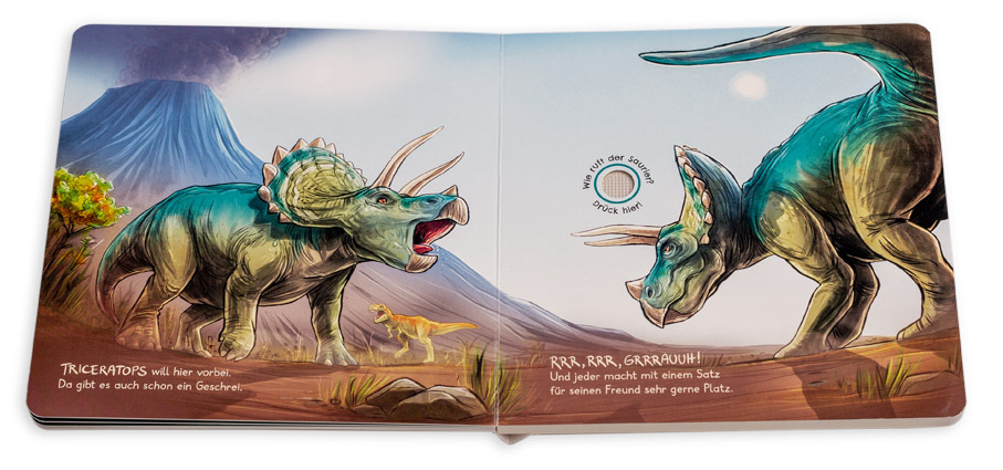 Dinosaurier wohin man schaut! In dem stabilen Pappbilderbuch mit den coolen Bildern können Kinder ab 2 Jahren ihre Lieblingstiere aus der Urzeit per Soundbutton zum Leben erwecken. Wie brüllt der T-Rex ? Wie quieken die Brachiosaurus -Babys? Und wie klingt ei...