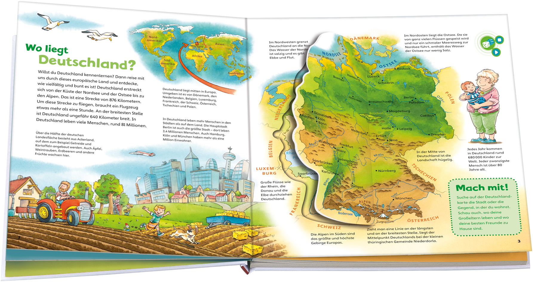 Wie klingt der Glockenschlag des Kölner Doms? Wo grasen friedlich mähende Heidschnucken? Und wie hört es sich an, wenn auf dem Frankfurter Flughafen ein Flugzeug startet? Spannendes über ihr Heimatland Deutschland können die Kinder in diesem Buch nicht nur les...