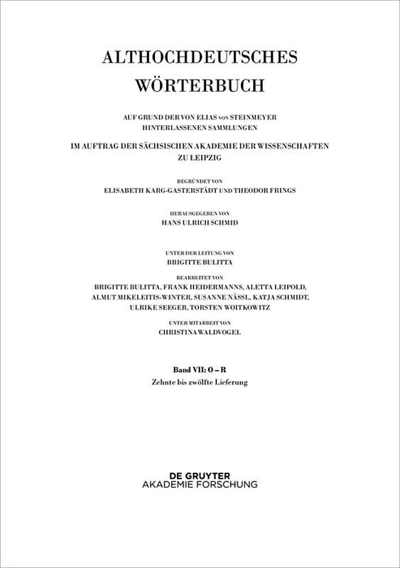 The Dictionary of Old High German will comprise ten volumes, and has been published in installments since 1952 by the Saxon Academy of Sciences in Leipzig. After the death of Karg-Gasterstädt and Frings, it was edited by Rudolf Große from 1968 to 2002, and la...