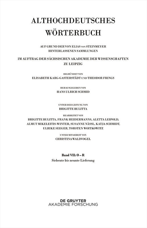 The Dictionary of Old High German will comprise ten volumes, and has been published in installments since 1952 by the Saxon Academy of Sciences in Leipzig. After the death of Karg-Gasterstädt and Frings, it was edited by Rudolf Große from 1968 to 2002, and la...