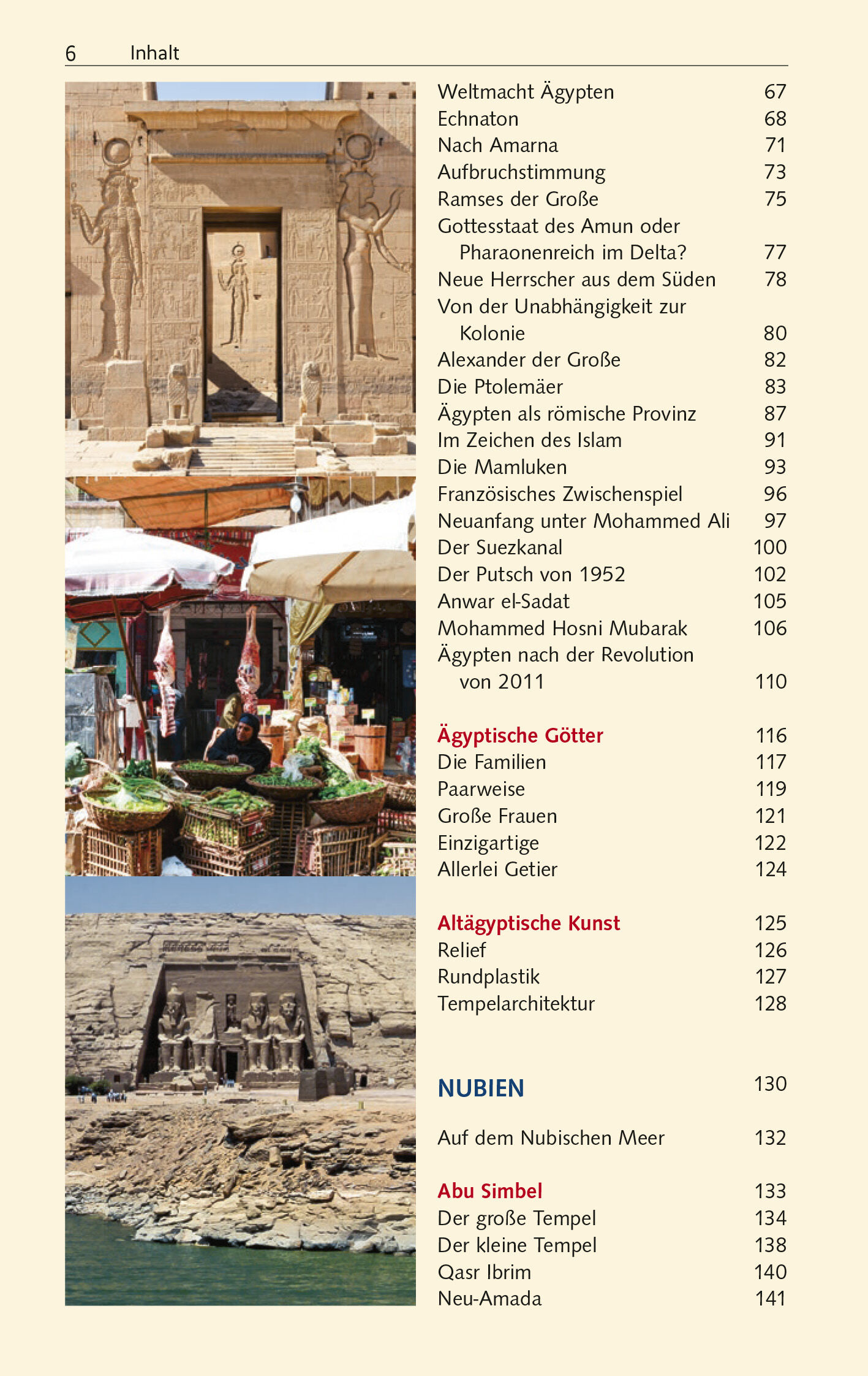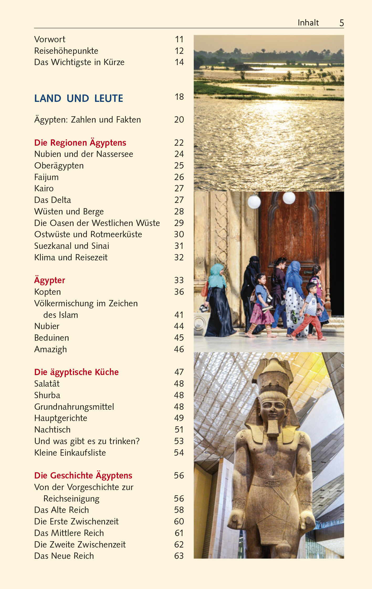 Imposante Tempelstätten, Pyramiden und Grabanlagen: Von Abu Simbel über Assuan, Luxor und Karnak bis Gizeh geht die Reise, von den Felstempeln Ramses' II. über den Amun-Tempel von Karnak, Theben West und das geheimnisvolle Totenreich im Tal der Könige bis zu den Pyramiden von Gizeh. Aber auch die jüngere Landesgeschichte hat herausragende Zeugnisse hinterlassen. Im chaotischen, pulsierenden Kairo, der größten arabischen Metropole, herrscht ein spannender Mix aus pharaonischer, christlicher und islamischer Welt. Das Ägyptische Museum zeigt atemberaubende Schätze aus fünf Jahrtausenden. Die Altstadt mit Zitadelle und ihren berühmten Moscheen zählt zum UNESCO-Welterbe. Der legendäre Basar Khan el-Khalili wartet zwischen duftenden Gewürzen und Touristen-Kitsch mit traditionellem Kunsthandwerk und Antiquitäten auf.