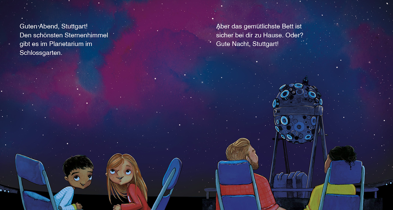 Grüß Gott, Stuttgart hier gibt es so viel zu entdecken! Du kannst auf den Fernsehturm steigen, die Tiere im Zoo Wilhelma besuchen und auf dem Cannstatter Wasn Karussell fahren. Und wenn die Sonne untergeht, heißt es: Gute Nacht, Stuttgart, es war ein schöner T...