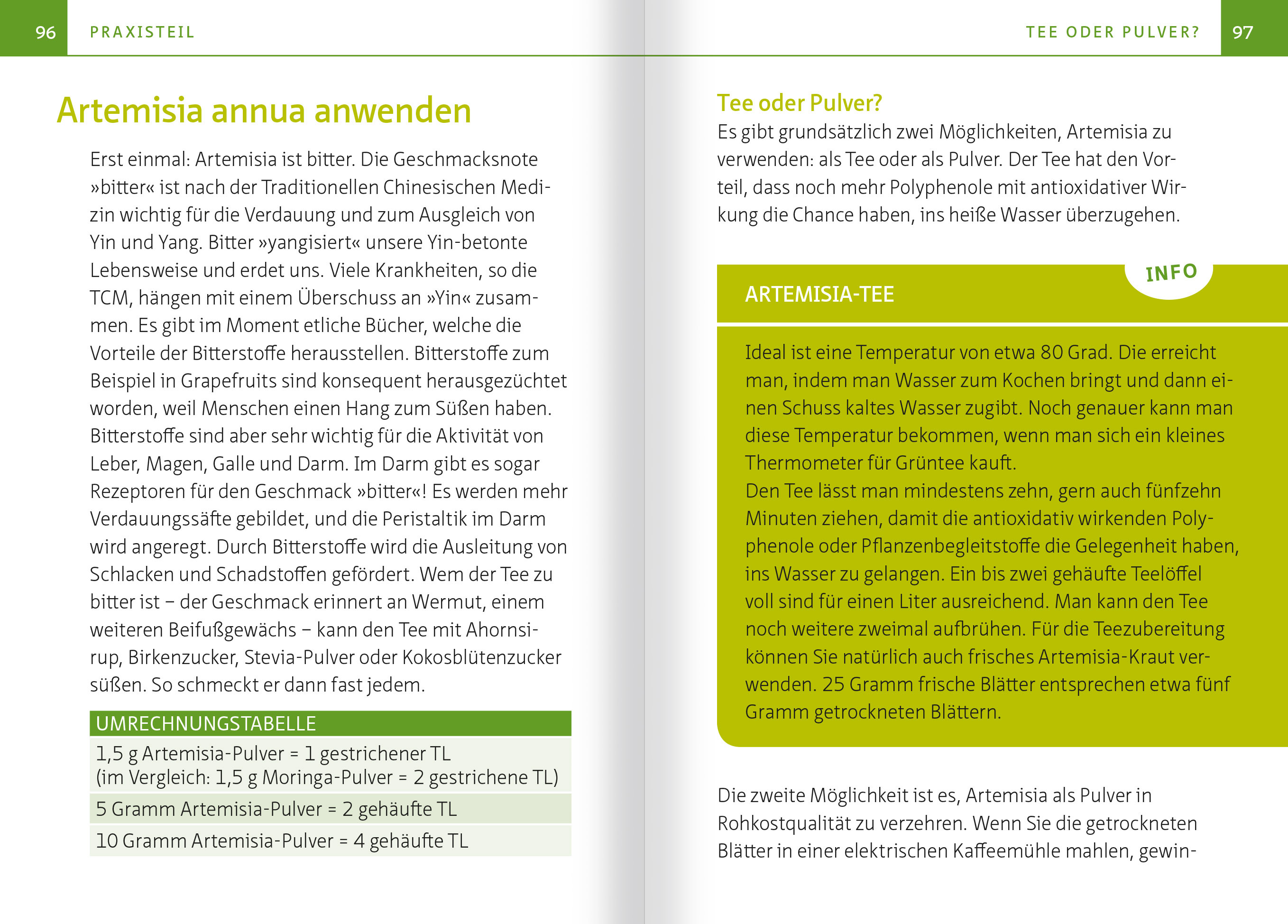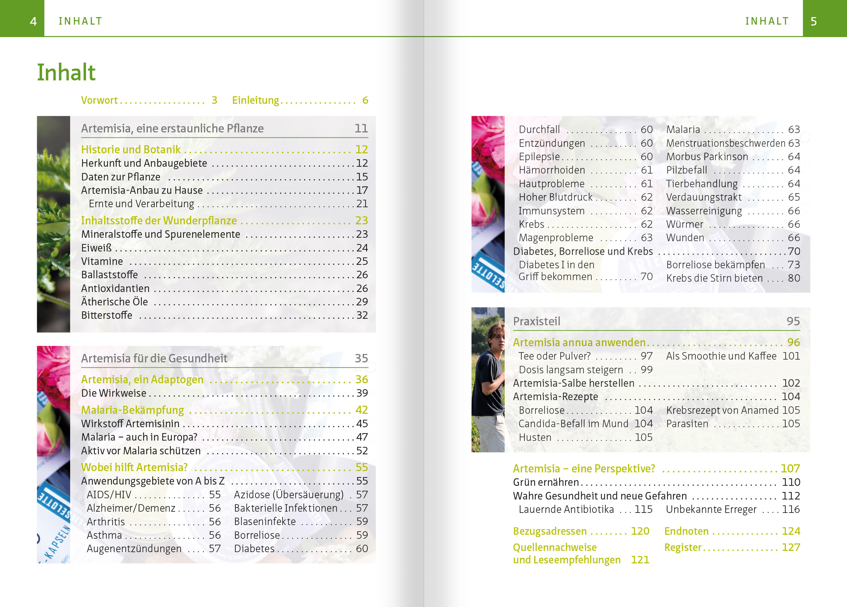 INHALT Vorwort Einleitung ARTEMISIA, EINE ERSTAUNLICHE PFLANZE Historie und Botanik - Herkunft und Anbaugebiete - Daten zur Pflanze - Artemisia-Anbau zu Hause - Ernte und Verarbeitung Inhaltsstoffe der Wunderpflanze - Mineralstoffe und Spurenelemente - Eiweiß - Vitamine - Ballaststoffe - Antioxidantien - Ätherische Öle - Bitterstoffe ARTEMISIA FÜR DIE GESUNDHEIT Artemisia, ein Adaptogen - Die Wirkweise Malaria-Bekämpfung - Wirkstoff Artemisinin - Malaria - auch in Europa? - Aktiv vor Malaria schützen Wobei hilft Artemisia? Anwendungsgebiete von A bis Z - AIDS/HIV - Alzheimer/Demenz - Arthritis - Asthma - Augenentzündungen - Azidose (Übersäuerung) - Bakterielle Infektionen - Blaseninfekte - Borreliose - Diabetes - Durchfall - Entzündungen - Epilepsie - Hämorrhoiden - Hautprobleme - Hoher Blutdruck - Immunsystem - Krebs - Magenprobleme - Malaria - Menstruationsbeschwerden - Morbus Parkinson - Pilzbefall - Tierbehandlung - Verdauungstrakt - Wasserreinigung -…