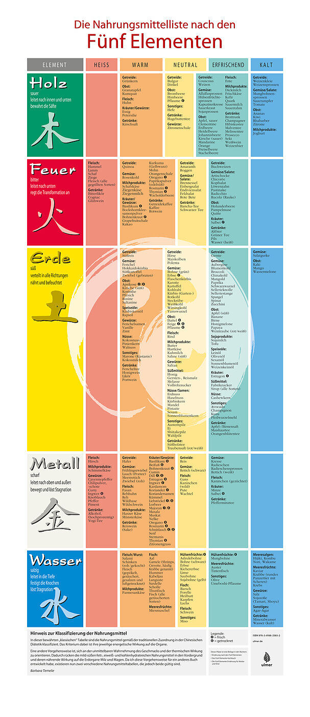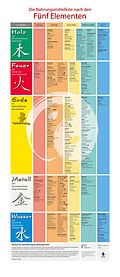 Dieses Poster zeigt die energetische Einteilung von über 200 Nahrungsmitteln nach den -Fünf Elementen- (trad. "5 Wandlungsphasen") gemäß der Chinesischen Medizin (TCM): "Holz", "Feuer", "Erde", "Metall" und "Wasser". Zudem werden diese Nahrungsmittel den therm...