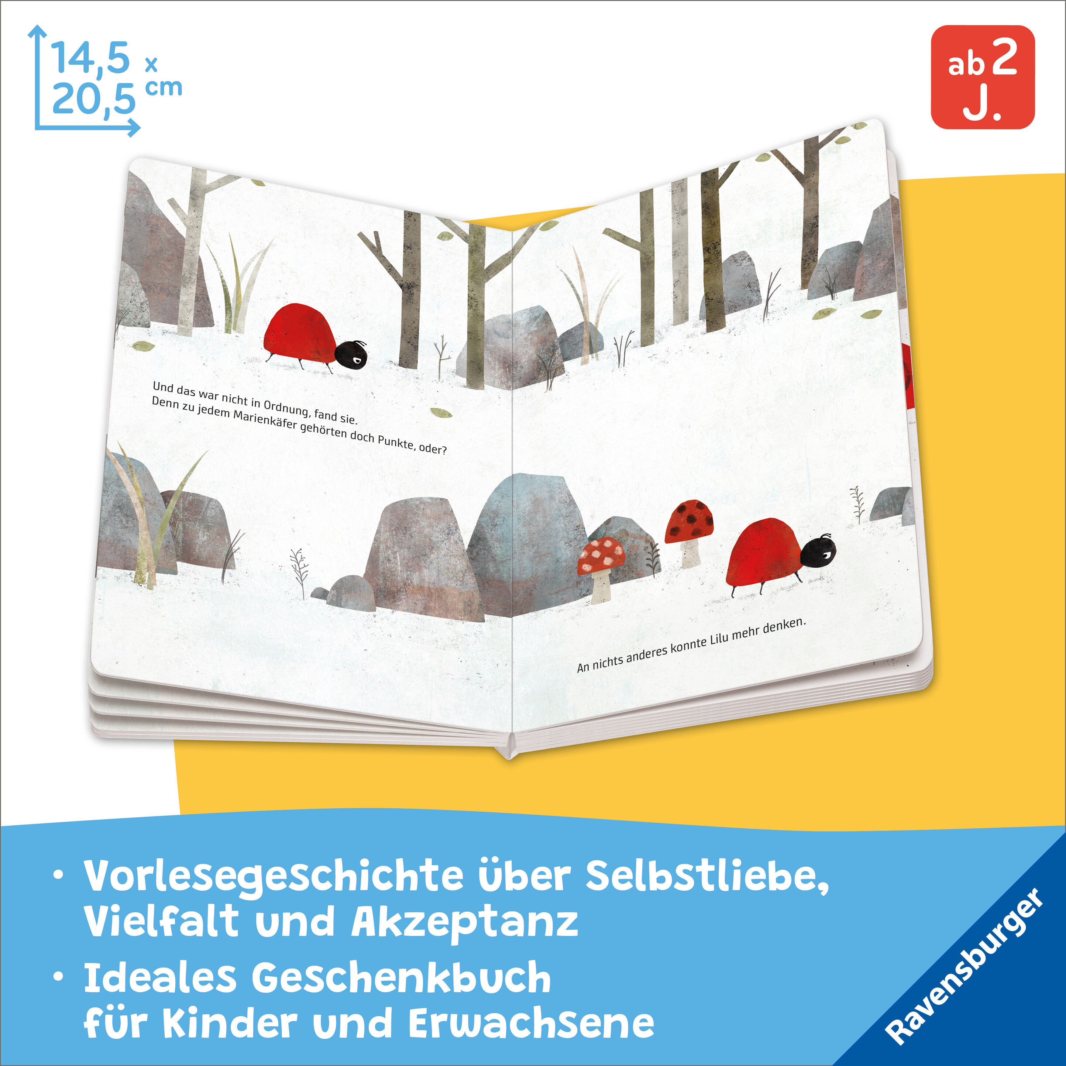 Wir sind gut, so wie wir sind: Ein Pappbilderbuch über Selbstliebe und Vielfalt Wie gemein! Lilu ist der einzige Marienkäfer ohne Punkte. Am liebsten möchte sie sich deswegen einfach nur verstecken. Denn zu jedem Marienkäfer gehören doch Punkte. Oder? Da triff...