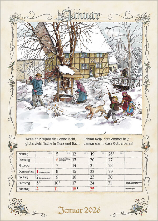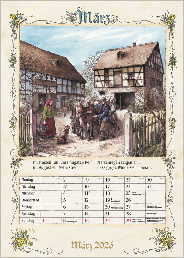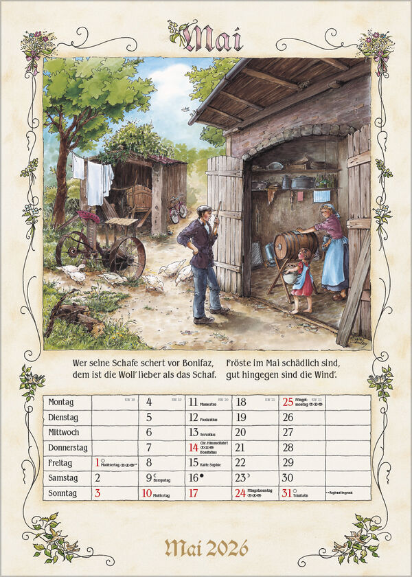 Dieser Kalender fügt sich nahtlos in jede gemütlich-rustikale Umgebung ein. Mit nostalgischen Bildern von Christa Versley, Bauernregeln und Platz für Eintragungen. Zwei Bauernregeln pro Monat Kalendarium auf Deutsch; Feiertage für Deutschland, Österreich und ...
