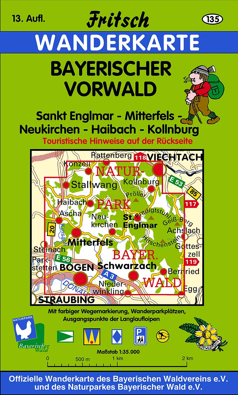 Der Ausschnitt der Karte reicht von Konzell im Norden bis Bogen/Schwarzach im Süden. Im Ostensind der Predigtstuhl und Bernried dargestellt. Im Westen Stallwang /Ascha.