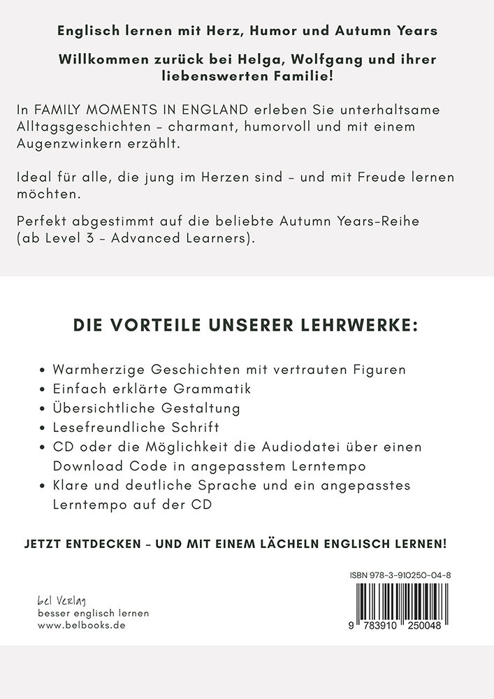 Englisch lernen mit Herz, Humor und Autumn Years Begleiten Sie Helga, Wolfgang, Tochter Anja, Schwiegersohn John und Enkelin Lilly auf neuen, liebevoll erzählten Abenteuern in England! Das neue Lehrwerk FAMILY MOMENTS IN ENGLAND bietet Ihnen unterhaltsame Ges...