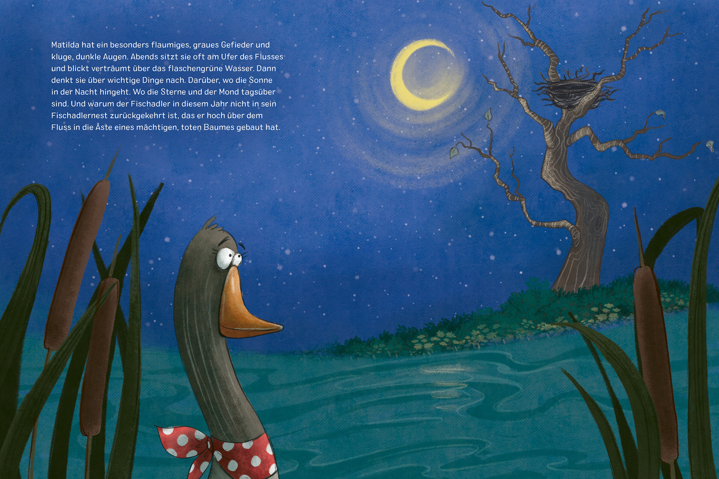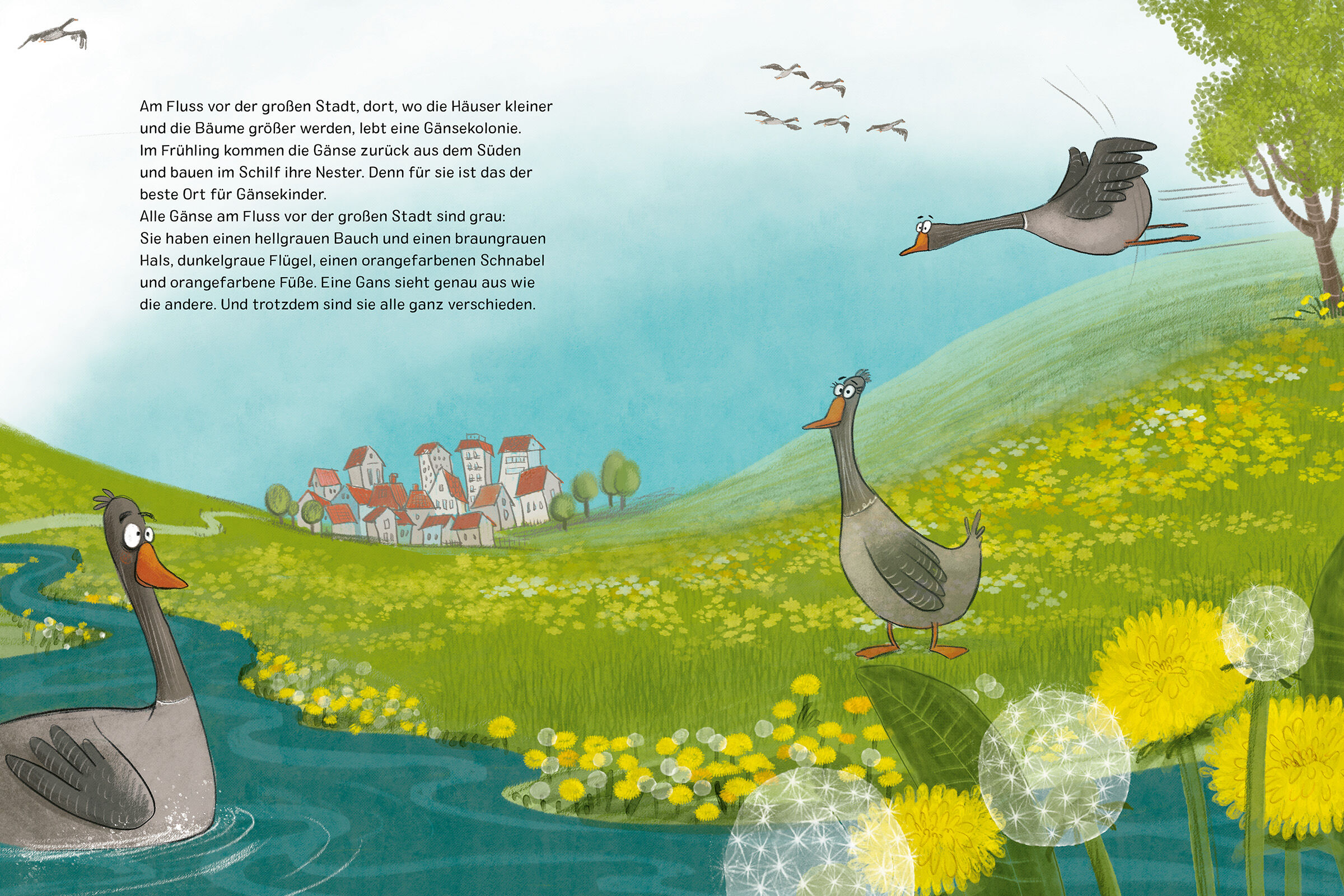 Am flaschengrünen Fluss vor der großen Stadt lebt eine Gänsekolonie. Im Frühling, wenn die Wiesen wieder saftig werden, kommen sie zurück aus dem Süden geflogen und beginnen, im Schilf ihre Nester zu bauen. Sie sehen sich äußerlich alle sehr ähnlich, aber inn...