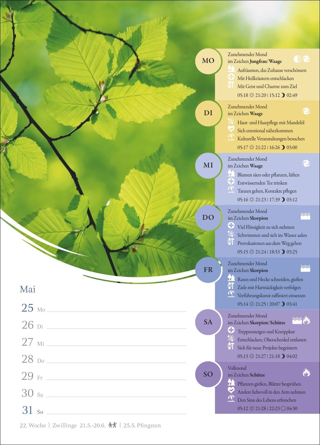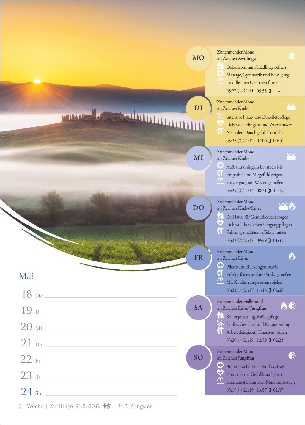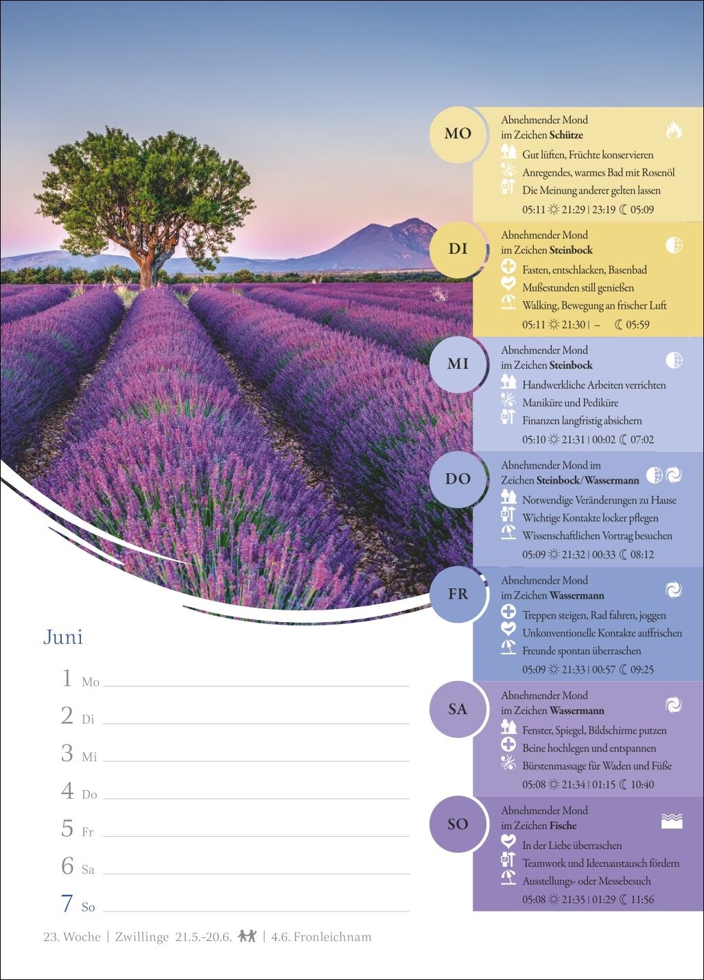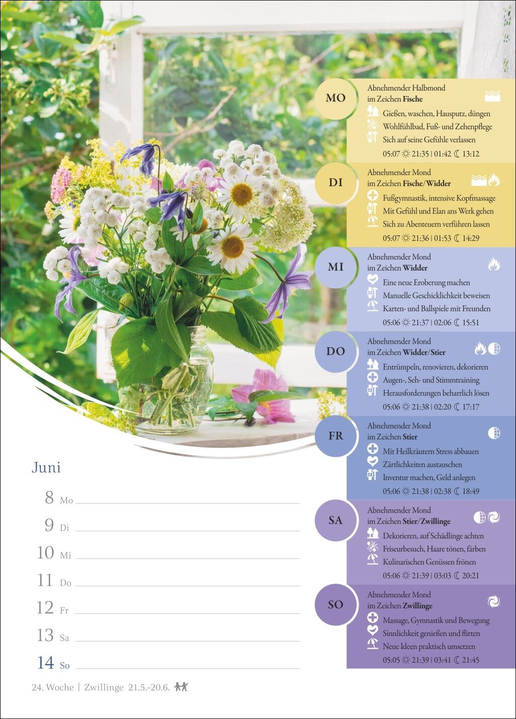 Leben im Zeichen des Mondes: ein Wochenkalender, der altes Wissen neu vermittelt - Was tun bei Neumond? Wann ist der richtige Zeitpunkt für Friseurtermine? Und welche Übungen stärken mich heute besonders? Ein Blick in den Mondkalender verrät es - Genau im Bl...