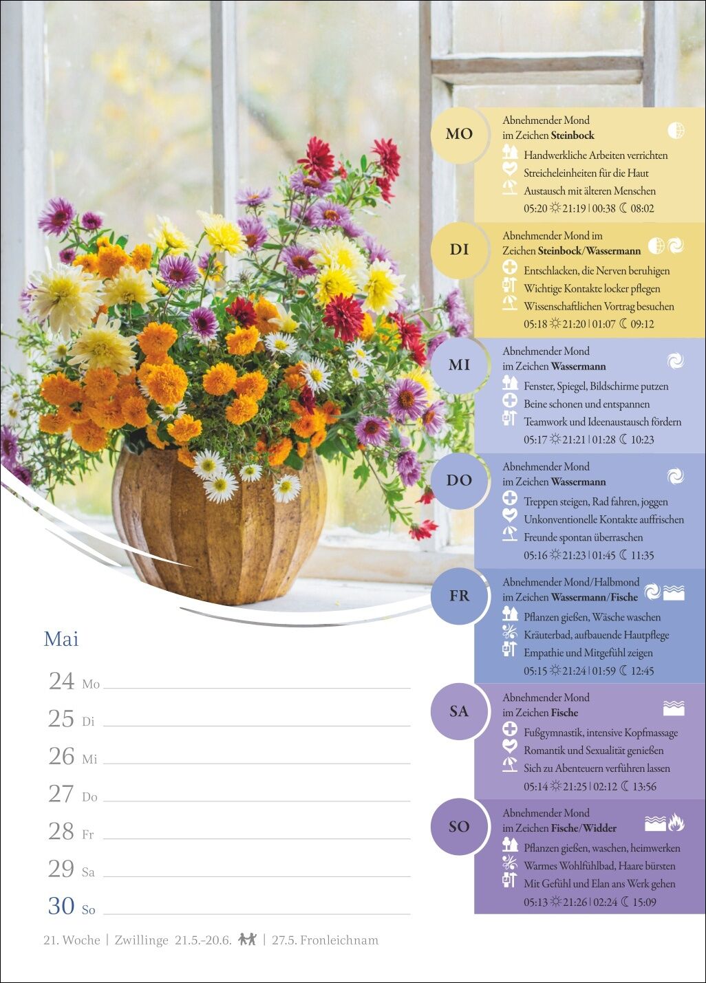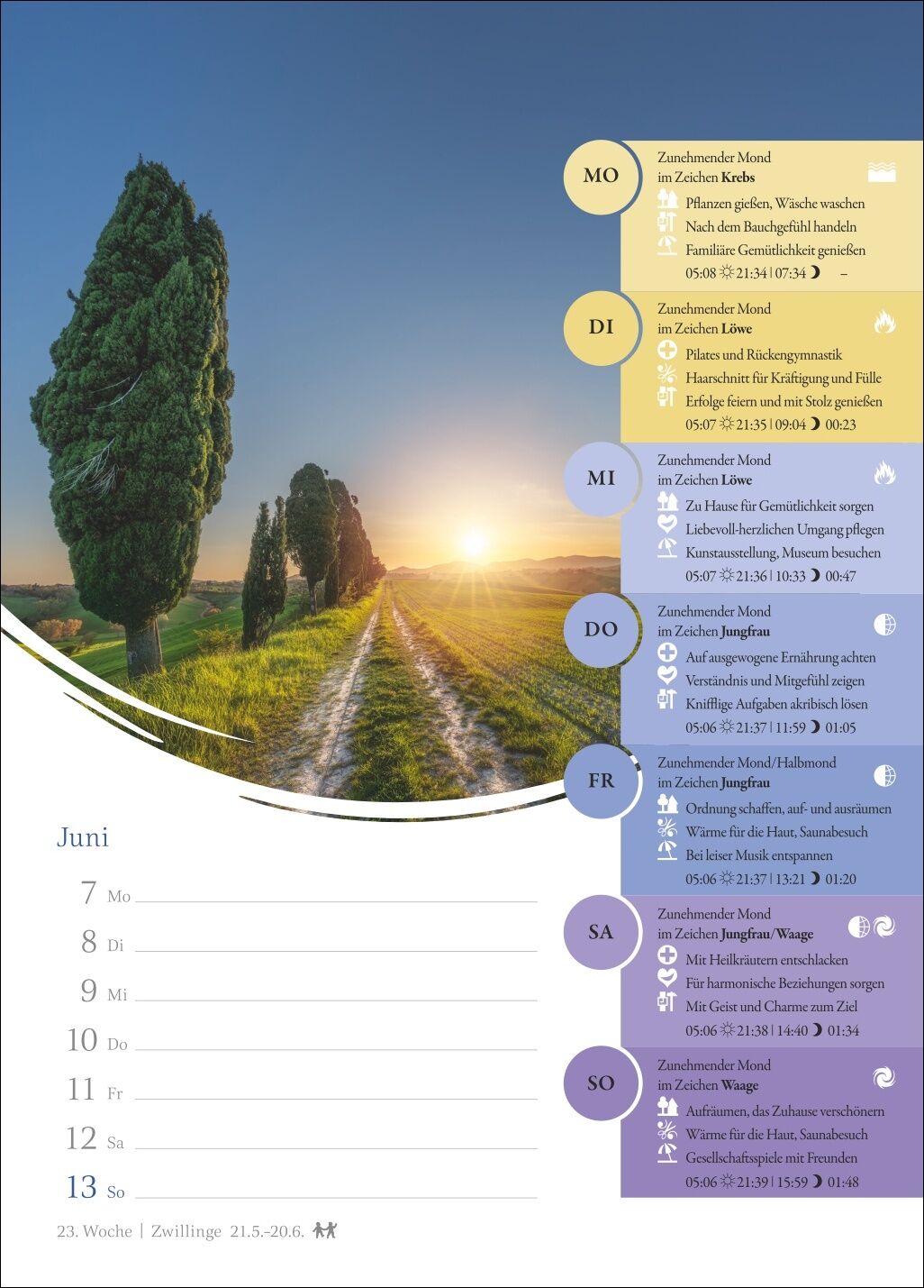 Leben im Zeichen des Mondes: ein Wochenkalender, der altes Wissen neu vermittelt - Was tun bei Neumond? Wann ist der richtige Zeitpunkt für Friseurtermine? Und welche Übungen stärken mich heute besonders? Ein Blick in den Mondkalender verrät es - Genau im Bl...