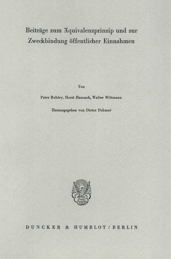Inhalt Inhalt: W. Wittmann, Zweckbindung öffentlicher Einnahmen - H. Hanusch, Äquivalenzprinzip und kollektive Güter. Allokationstheoretische Aspekte - P. Bohley, Praktische Probleme bei der Anwendung des Äquivalenzprinzips