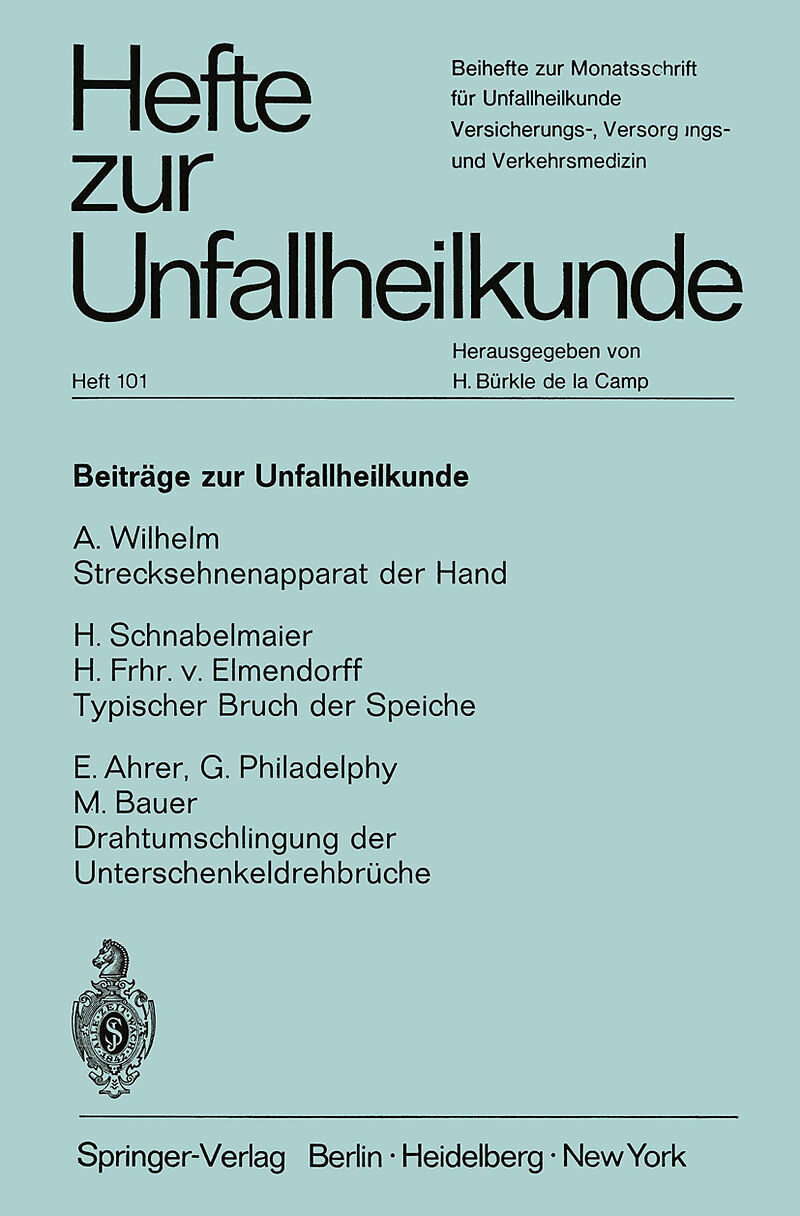 Drei Manuskripte werden in diesem Heft veroffentlicht. Sie behan deln zwar verschiedene Themen, die aber aIle in das weite Gebiet der Unfallheilkunde gehOren. Der Beitrag von A. WILHELM "Zur Anatomie und Chirurgie des Strecksehnenapparates der Hand unter ...Drei Manuskripte werden in diesem Heft veroffentlicht. Sie behan deln zwar verschiedene Themen, die aber aIle in das weite Gebiet der Unfallheilkunde gehOren. Der Beitrag von A. WILHELM "Zur Anatomie und Chirurgie des Strecksehnenapparates der Hand unter Beriicksichtigung neuerer Opera tionsmethoden" berichtet iiber wertvoIle anatomische Studien an den Strecksehnen der Hand, die fiir chirurgische Eingriffe, besonders fiir neuzeitliche handchirurgische Operationen, von Bedeutung sind. Die von H. SCHNABELMAIER begonnenen und nach dessen UnfaIltod von H. v. ELMENDORFF zu Ende gefiihrten und zur Veroffentlichung zusammengestellten Untersuchungen "Der Bruch der Speiche an typi scher Stelle und seine Entstehung" sind von besonderem Wert fiir unsere Kenntnisse iiber Entstehung, Behandlung und Begutachtung dieser haufigen Verletzung. "Die subcutane Drahtumschlingung der Unterschenkelbruche" wurde infolge der belastungs- und funktionsstabilen Osteosynthesemethoden heftiger Kritik ausgesetzt. Es erscheint daher wichtig, die erfahrenen Kenner dieses Behandlungsverfahrens, E. AHRER, E. PHILADELPHY und M. BAUER, ausfiihrlich iiber ihre guten Erfahrungen bei richtiger An wendung der subcutanen Drahtumschlingung an einem groBen Verletzten gut zu Wort kommen zu lassen. Mogen diese aneinandergereihten Arbeiten das erwartete Interesse bei den Lesern der "Hefte zur Unfallheilkunde" finden. 1m September 1969 Der Herausgeber H. BURKLE DE LA CAMP Inhaltsiibersicht Seite Von Privatdozent Dr. A. WILHELM, Wurzburg: Zur Anatomie und Chirurgie des Strecksehnenapparates der Hand unter Berucksichtigung neuerer Operationsmethoden . . . . .. 1 Von Dr. H. SCHNABELMAIER t und Privatdozent Dr. H. Frhr. von ELMENDORFF, Dusseldorf: Der Bruch der Speiche an typischer Stelle und seine Entstehung.