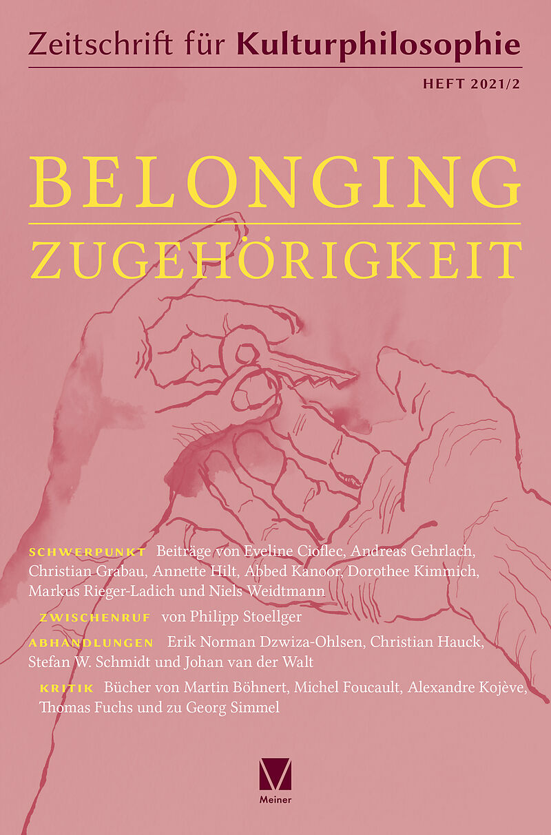 Becker, Ralf, Bermes, Christian, Westerkamp, Dirk: Editorial. Cioflec, Eveline, Weidtmann, Niels: Einleitung. Belonging - Zugehörigkeit Kimmich, Dorothee: Belonging Zugehörigkeit und Eigentum. Eine prekäre Verbindung »Belonging« is usually discussed in the con...Becker, Ralf, Bermes, Christian, Westerkamp, Dirk: Editorial. Cioflec, Eveline, Weidtmann, Niels: Einleitung. Belonging - Zugehörigkeit Kimmich, Dorothee: Belonging Zugehörigkeit und Eigentum. Eine prekäre Verbindung »Belonging« is usually discussed in the context of social participation. However, the English »belonging« also associates similar to the German word zugehörig the aspect of possession and property: it is also about »belongings«. In the following, various examples from religion, politics, literature, and film will be used to discuss the narratives that intertwine social belonging and material possession and reveal as well as conceal their (neo)mythical connection. Gehrlach, Andreas: Die Zugehörigkeit der Dinge zu den Menschen. Western Culture knows only a single judicial concept of ownership: private property. Private property meaning, all things belong to people in the same normalized way. A closer look reveals that our relationship with things is more complex than that and confirms a gradual belonging of things to persons that stretches from an organic or intimate property to things being only vaguely attached to persons. This essay tries to outline this plural concept of ways of owning. Cioflec, Eveline: Vom zugehörigen Selbst. Narrative der Gemeinschaft In my paper I discuss belonging to a community as a lived experience aiming at interrogating with Hannah Arendt the dynamics of constituting or reshaping communities through action. The ungraspable »we« of communities allows for both constraining narratives and initiating new forms of belonging as a response to the need to belong. Acting together creates communities which can overturn the often painful experience of belonging to unbearable social units. Kanoor, Abbed: Gezähmte Schizophrenie. Eine philosophische Analyse von Zugehörigkeit und kultureller Ich-Spaltung Our time as the age of fragmented cultural ontologies, acceleration, and ongoing socio-cultural transformations is the age of the quest of belonging par excellence. My paper deals with this quest out of a singular culturally situated perspective the work of the Indologist and comparative philosopher Daryush Shayegan (19352018) which despite its singularity hints at a general hypothesis: the recognition of a tamed cultural schizophrenia can be an inspiring model of belonging for our time. Rieger-Ladich, Markus: Tertium non datur. Über Gewalt und Zugehörigkeit The books by Annie Ernaux and Didier Eribon can be interpreted as testimonies of the struggle for belonging. With their rich descriptions of growing up in poverty, of shame and degradation, they make an important contribution to the analysis of orders of belonging. Educational institutions play a significant role in this. In this way, Ernaux and Eribon shed light on the mechanisms through which belonging is created or denied. Grabau, Christian: Umkämpfte Zugehörigkeit. Ralph Ellison und das Recht des Künstlers, seine Vorfahren zu wählen »[W]hile one can do nothing about choosing one's relatives, one can, as artist, choose one's ancestors.« These words lead to the heart of a dispute between Ralph Ellison and the Dissent editor Irving Howe in the early sixties which had an impact far beyond literary criticism and scholarship. From this well documented controversy we can learn something about both the power of attributions of belonging and the art of evading them. Hilt, Annette: Ein Zuhause, das mehr als Heimat ist. Phänomenologische Überlegungen zur Zugehörigkeit My contribution interrogates how to conceive belonging and how to clarify conceptual connotations of this and other concepts as home or a dwelling in a place according to their meaning for orienting our social life and identities. Methodically, I start with the phenomenological consideration of operative concepts and how these might be reflexively brought into work with experiencing loss of belonging, negation of a home to stay in, and infraction of identity as they are expressed in personal life-stories. Weidtmann, Niels: Zugehörigkeit als Menschenrecht. Eine phänomenologische Intervention Based on her own experience of long years of statelessness, Arendt demands that the right of the individual to belong to a political community be recognized as the only human right. However, while the »right to have rights« can serve as a regulative idea, belonging that respects an individual's personhood can neither be decreed nor granted but must have constitutive meaning for the individual. In the article, belonging therefore is described as different ways of a human's being-in-the-world or simply as different ways of experience. Stoellger, Philipp: Von der Theodizee zur Religiodizee. Zur neuen Lust an der Religionslosigkeit Dzwiza-Ohlsen, Erik Norman: Deixis Grundzüge einer phänomenologischen Anthropologie des Zeigens. Deixis als Praxis zwischen Berührung und Begriff Hauck, Christian: Fortschritt. Skizzen zu einer absoluten Metapher Schmidt, Stefan W.: Phänomenologie der Räumlichkeit und die Gestaltung des Sozialen. Entwurf einer Topologie des Social Design van der Walt, Johan: Recht, Poesie und liberale Demokratie. Überlegungen zu Voßkuhle, Kohlhaas und Kleist Kritik. Sophia Gräfe: Noch einmal nachdenken. Tierforschung für Philosophen (Martin Böhnert, Methodologische Signaturen. Ein philosophischer Versuch zur Systematisierung der empirischen Erforschung des Geistes von Tieren) Arne Klawitter: Die Erfahrung des Fleisches und die Hermeneutik des Begehrens. Michel Foucaults vierter Band von »Sexualität und Wahrheit« (Michel Foucault, Die Geständnisse des Fleisches) Nikola Mirkovi: Anerkennung als Autorität (Alexandre Kojève, Der Begriff der Autorität) 