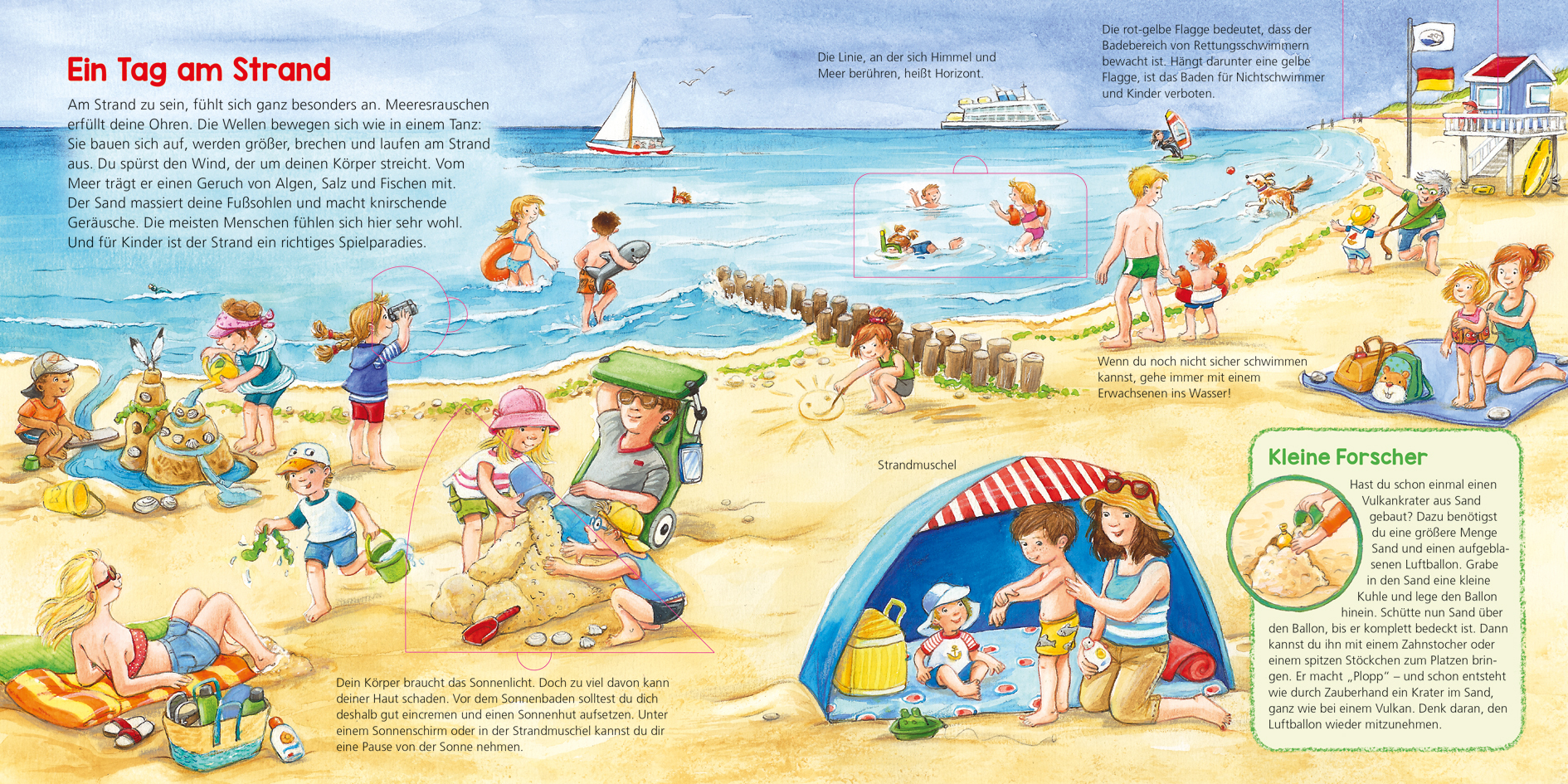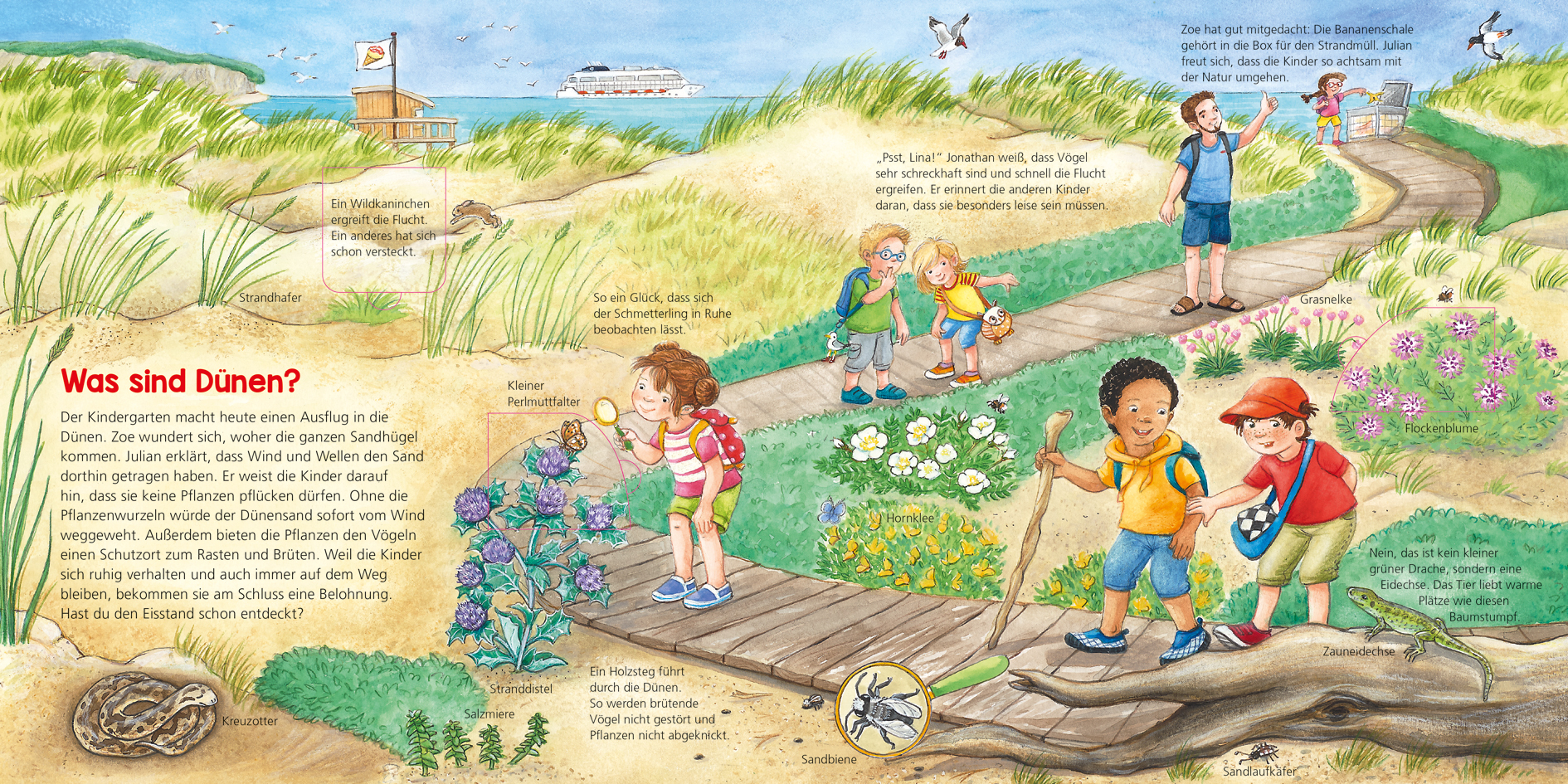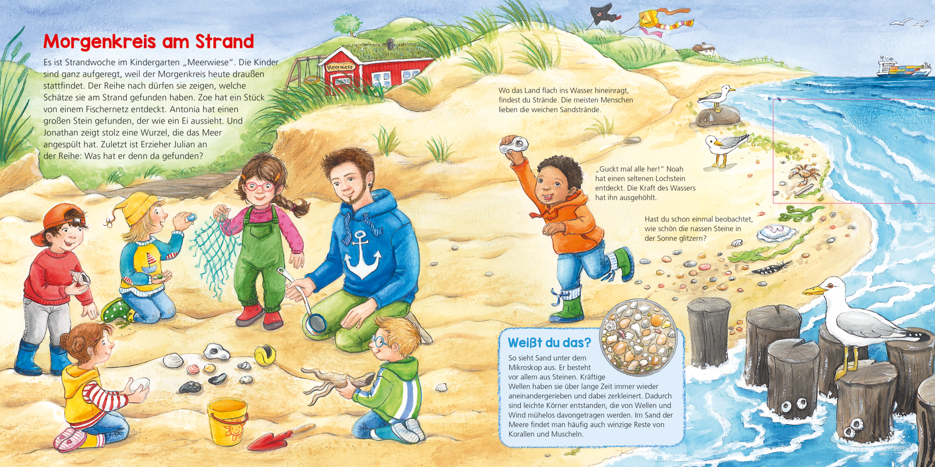 Es ist Strandwoche im Kindergarten! Alle sind ganz aufgeregt, am Strand zu sein. Meeresrauschen erfüllt die Ohren, der Sand massiert die Fußsohlen und überall gibt es viel zu entdecken. Hungrige Austernfischer und Sanderlinge durchsuchen den Sand nach Schnecke...