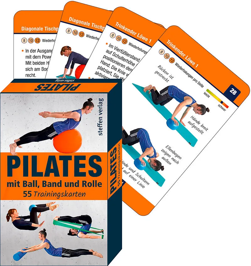 Effektiver und erfolgreicher trainieren mit den Trainingskarten Pilates mit Ball, Band und Rolle Pilates fördert eine gesunde Körperhaltung, stärkt die Tiefenmuskulatur und hilft bei der Stressbewältigung. Pilates-Übungen mit Geräten wie Ball, Band und Rolle s...
