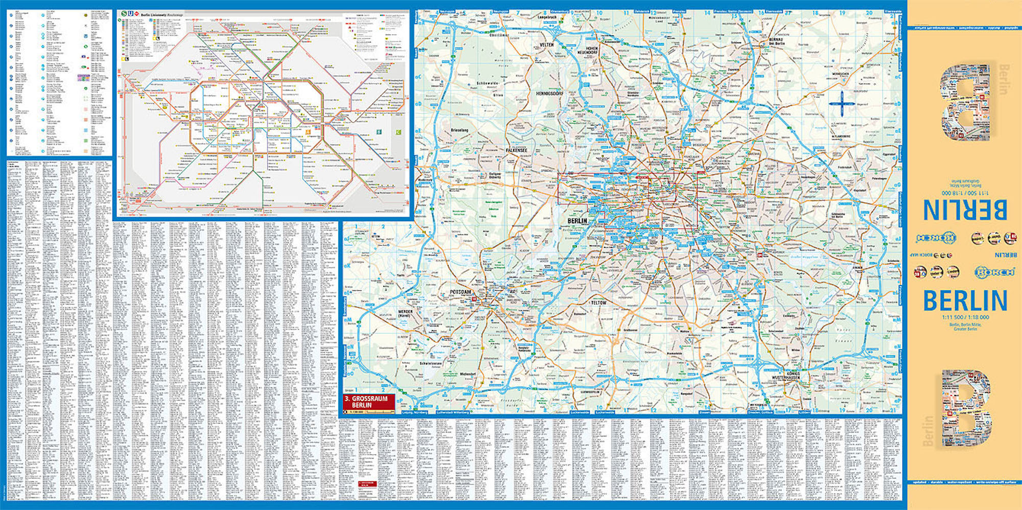 Our laminated and folded Borch Map of Berlin in the 21st edition contains: Berlin 1:18 000, Berlin Mitte 1:11 500, Greater Berlin 1:130 000, the Berlin Wall, the public transport system and an administrative map of Germany. Borch Maps contain a multitude of in...