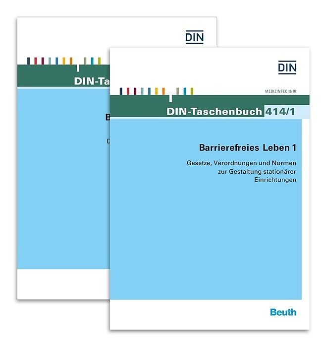 Mit dem zweibändigen DIN-Taschenbuch 414 "Barrierefreies Leben" erscheint im Beuth Verlag erstmals ein repräsentatives Gesamtwerk, das fachbereichsübergreifend Barrierefreiheit in unterschiedlichen Lebensbereichen, wie Wohnräumen, Arbeitsstätten, Kraftfahrzeug...