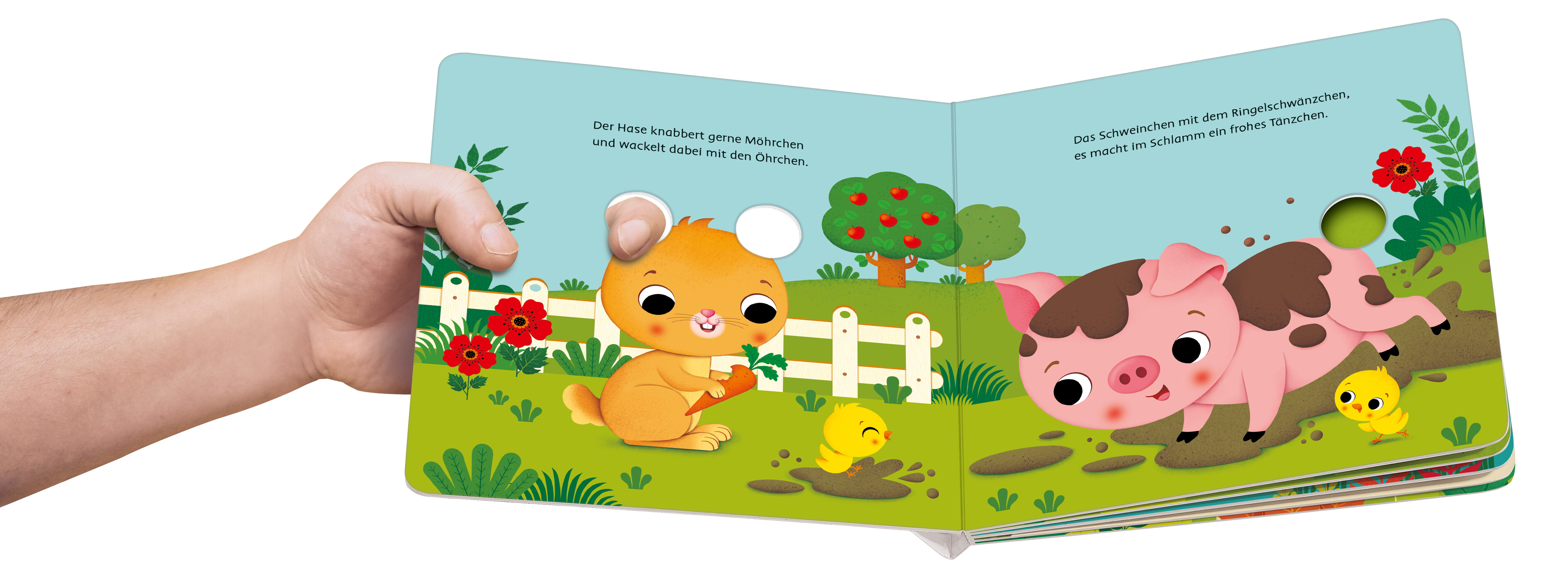 Ein lustiges Fingerspielbuch mit ersten Reimen Hier wackeln die Ohren und zappeln die Füße! Mit diesem ersten Fingerspielbuch können Eltern und Kinder in die Rolle vieler Lieblingstiere schlüpfen. Einfach die Finger durch die Löcher stecken und schon erwachen ...