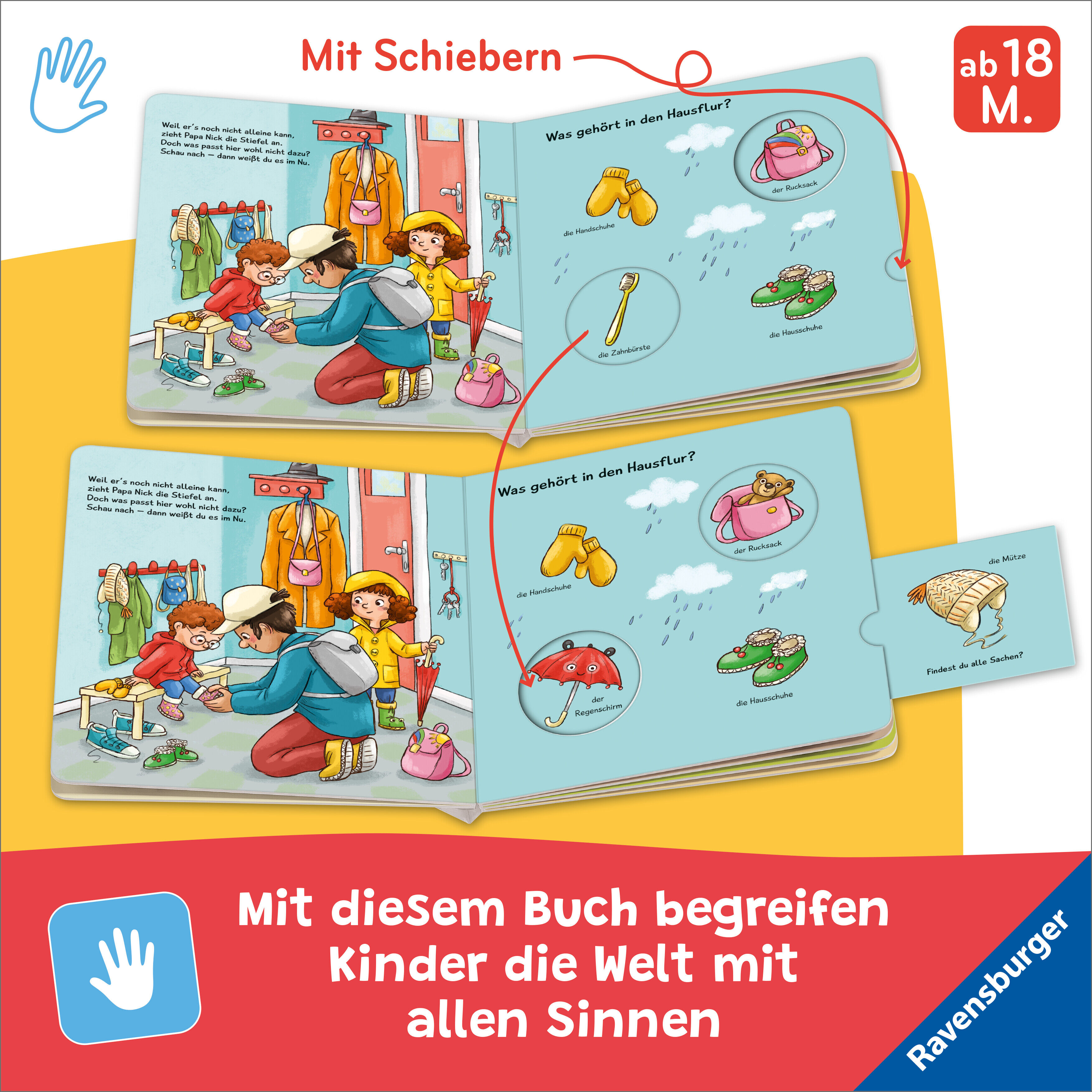 Was passt hier nicht? Großer Schiebespaß kombiniert mit einem lustigen Ratespiel Zu Hause gibt es allerlei Sachen. Aber was macht die Zahnbürste im Hausflur? Und gehört der Obstkorb wirklich ins Badezimmer? Auf jeder Seite befindet sich ein falscher Gegenstand...