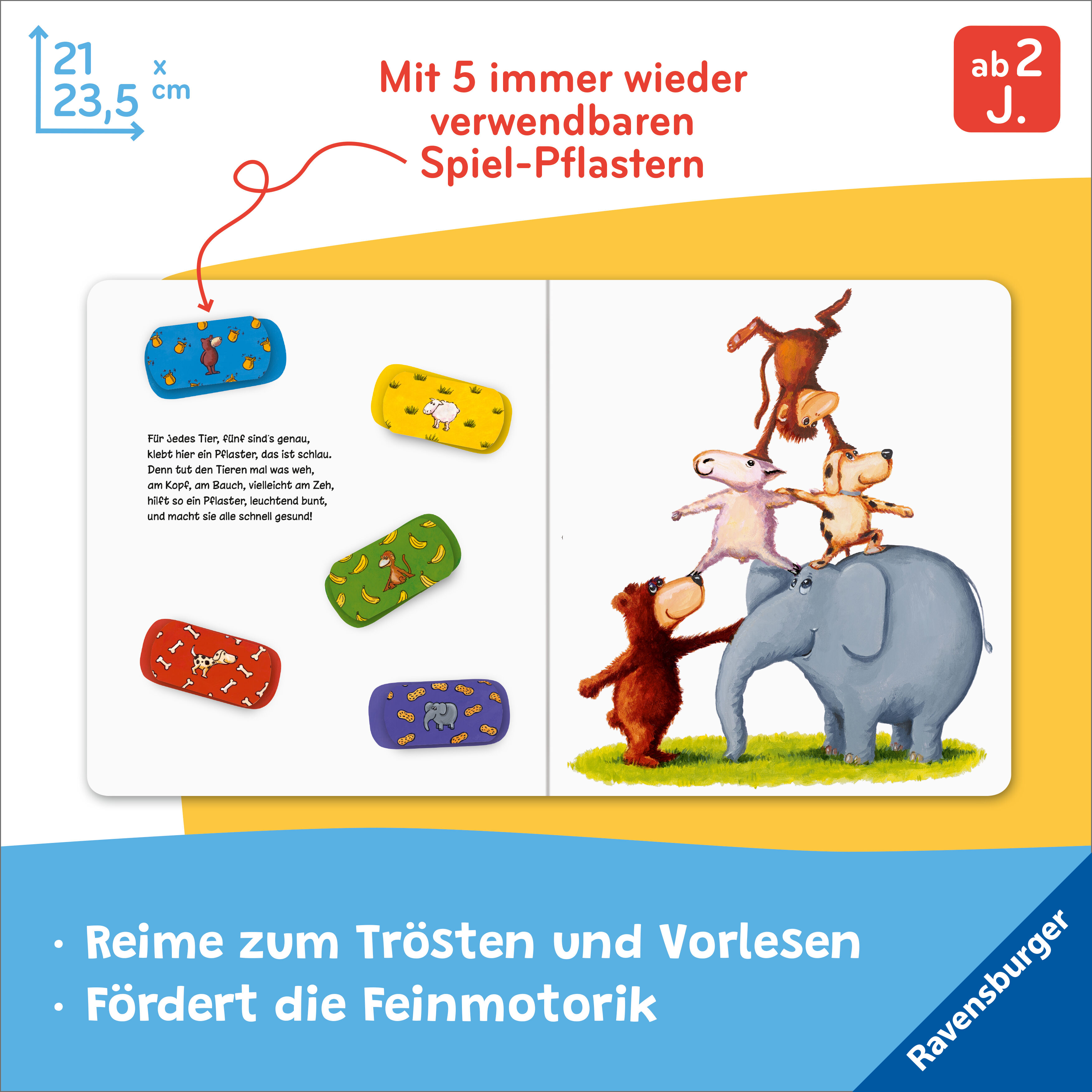 Verarzten leicht gemacht Dem Hund tut seine Pfote weh, das Affenkind hat eine Beule, das Schaf einen Kratzer am Bauch, der Elefant einen platten Rüssel und der Bär hat sich auf einen spitzen Ast gesetzt. Aua, das tut weh. Da ist ein Pflaster genau das Richtige...29 Kunden haben diesen Artikel kürzlich gekauft.