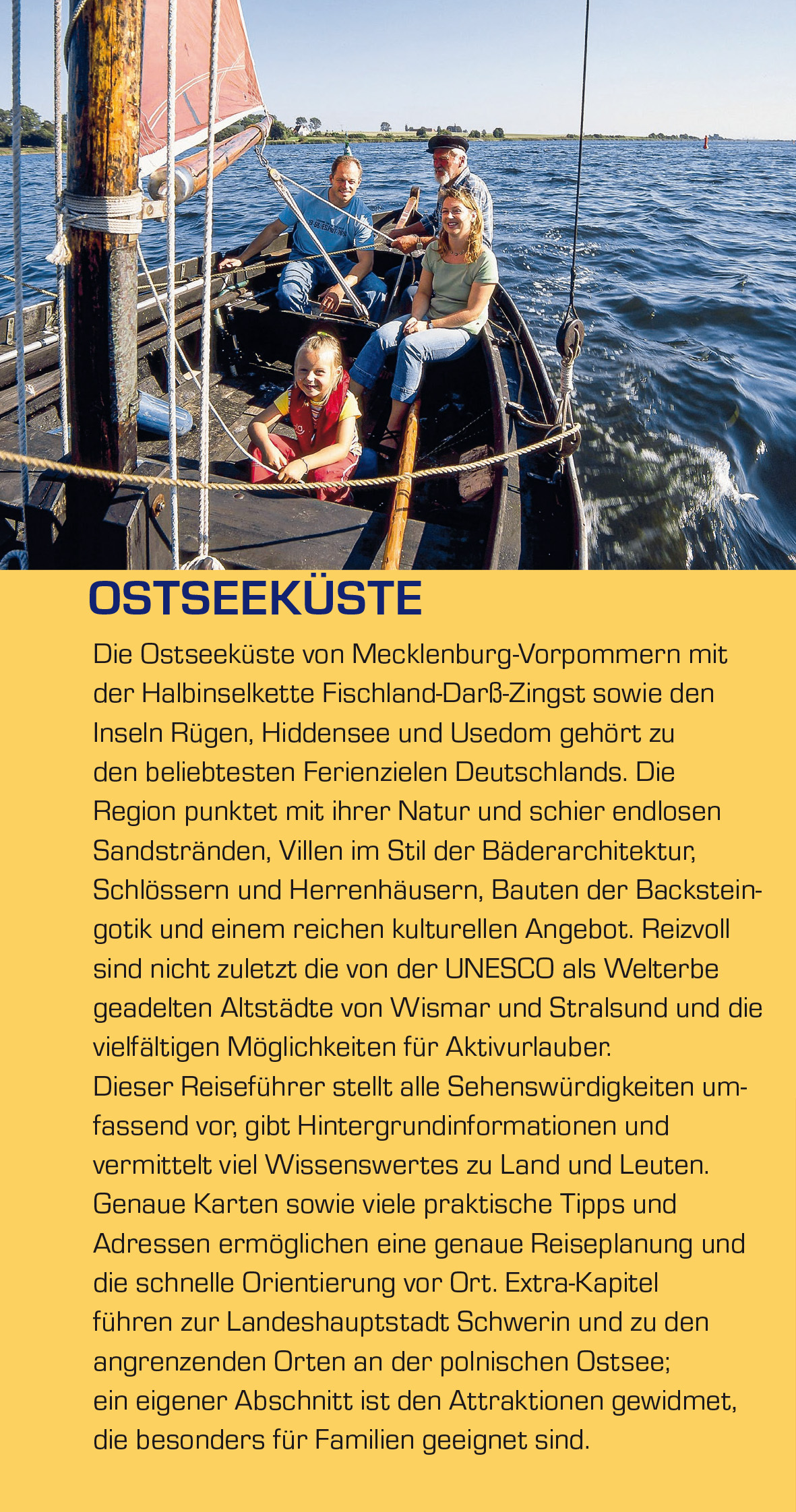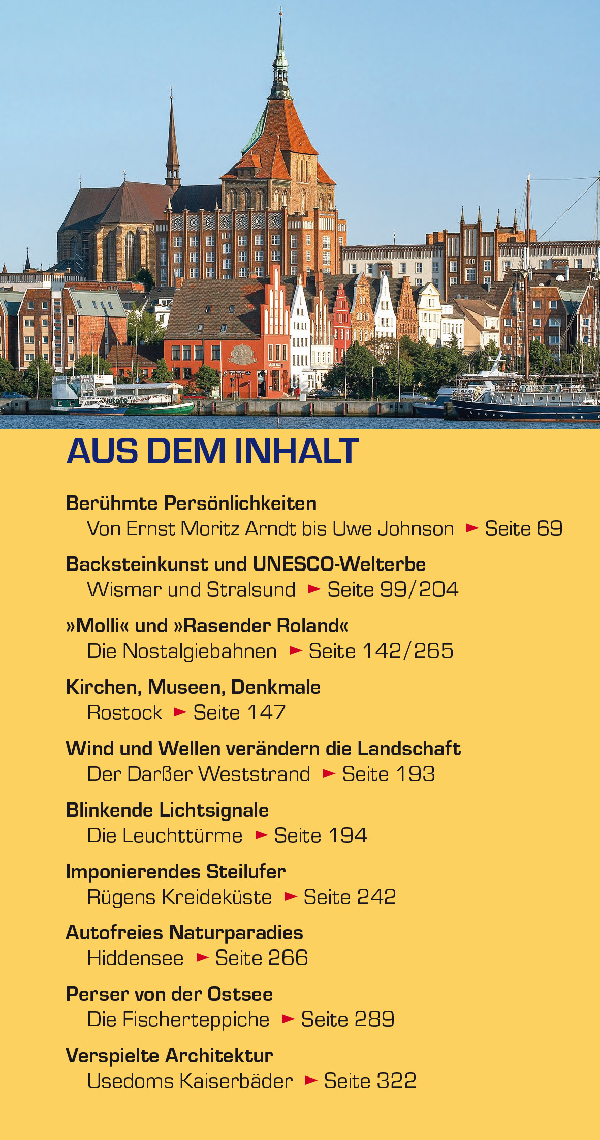 Seite 69 BACKSTEINKUNST UND UNESCO-WELTERBE Wismar und Stralsund > Seite 99/204 "MOLLI" UND "RASENDER ROLAND" Die Nostalgiebahnen > Seite 142/265 KIRCHEN, MUSEEN, DENKMALE Rostock > Seite 147 WIND UND WELLEN VERÄNDERN DIE LANDSCHAFT Der Darßer Weststrand > Seite 193 BLINKENDE LICHTSIGNALE Die Leuchttürme > Seite 194 IMPONIERENDES STEILUFER Rügens Kreideküste > Seite 242 AUTOFREIES NATURPARADIES Hiddensee > Seite 266 PERSER VON DER OSTSEE Die Fischerteppiche > Seite 289 VERSPIELTE ARCHITEKTUR Usedoms Kaiserbäder > Seite 322 Die Ostseeküste von Mecklenburg-Vorpommern mit der Halbinselkette Fischland-Darß-Zingst sowie den Inseln Rügen, Hiddensee und Usedom gehört zu den beliebtesten Ferienzielen Deutschlands. Die Region punktet mit ihrer Natur und schier endlosen Sandstränden, Villen im Stil der Bäderarchitektur, Schlössern und Herrenhäusern, Bauten der Backstein-gotik und einem reichen kulturellen Angebot. Reizvoll sind nicht zuletzt die von der UNESCO als Welterbe geadelten Altstädte von Wismar und Stralsund und die vielfältigen Möglichkeiten für Aktivurlauber. Dieser Reiseführer stellt alle Sehenswürdigkeiten umfassend vor, gibt Hintergrundinformationen und vermittelt viel Wissenswertes zu Land und Leuten. Genaue Karten sowie viele praktische Tipps und Adressen ermöglichen eine genaue Reiseplanung und die schnelle Orientierung vor Ort. Extra-Kapitel führen zur Landeshauptstadt Schwerin und zu den angrenzenden Orten an der polnischen Ostsee; ein eigener Abschnitt ist den Attraktionen gewidmet, die besonders für Familien geeignet sind. >>> Detaillierte Informationen zu diesem Trescher-Reiseführer und vielen weitere Titel zu interessanten Reisezielen in Deutschland finden Sie auf der Website des Trescher Verlags.