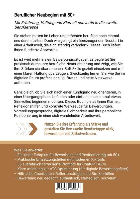 Dieses Buch begleitet Menschen ab 50 auf dem Weg zu einer erfolgreichen beruflichen Neuorientierung. Es zeigt, wie man mit Erfahrung, Haltung und Klarheit überzeugt im Lebenslauf, im Vorstellungsgespräch und im digitalen Auftritt. Statt allgemeiner Bewerbungst...