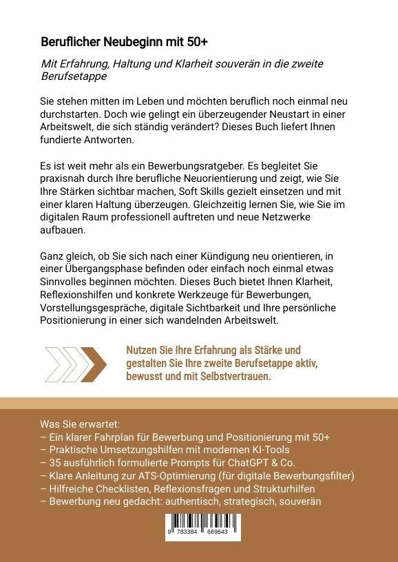 Dieses Buch begleitet Menschen ab 50 auf dem Weg zu einer erfolgreichen beruflichen Neuorientierung. Es zeigt, wie man mit Erfahrung, Haltung und Klarheit überzeugt im Lebenslauf, im Vorstellungsgespräch und im digitalen Auftritt. Statt allgemeiner Bewerbungst...
