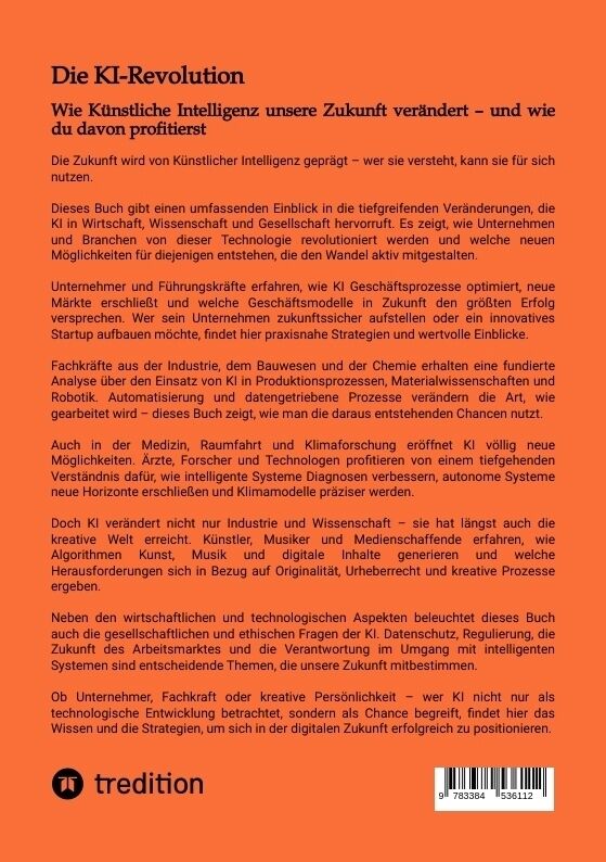 Das Buch Die KI-Revolution Wie Künstliche Intelligenz unsere Zukunft verändert und wie du davon profitierst bietet eine tiefgehende und fundierte Auseinandersetzung mit den technologischen, wirtschaftlichen und gesellschaftlichen Entwicklungen, die durch den F...