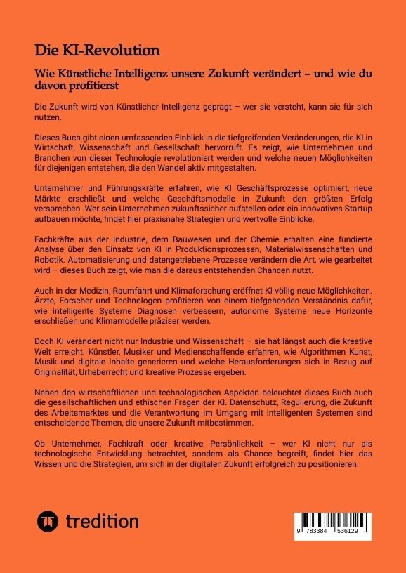 Das Buch Die KI-Revolution Wie Künstliche Intelligenz unsere Zukunft verändert und wie du davon profitierst bietet eine tiefgehende und fundierte Auseinandersetzung mit den technologischen, wirtschaftlichen und gesellschaftlichen Entwicklungen, die durch den F...Das Buch Die KI-Revolution Wie Künstliche Intelligenz unsere Zukunft verändert und wie du davon profitierst bietet eine tiefgehende und fundierte Auseinandersetzung mit den technologischen, wirtschaftlichen und gesellschaftlichen Entwicklungen, die durch den Fortschritt der Künstlichen Intelligenz vorangetrieben werden. Es beleuchtet, wie KI nicht nur bestehende Industrien transformiert, sondern auch völlig neue Geschäftsfelder erschließt und gesellschaftliche Strukturen nachhaltig verändert. Ein zentraler Fokus liegt auf der praktischen Anwendung dieser Technologie in verschiedenen Branchen. KI hat längst Einzug in die Wirtschaft gehalten, automatisiert Prozesse, optimiert Entscheidungsstrukturen und eröffnet innovative Geschäftsmodelle, die bislang nicht denkbar waren. Besonders in den Bereichen Industrie, Bauwesen, Medizin, Raumfahrt und Klimaforschung zeigt das Buch auf, wie intelligente Systeme Abläufe effizienter gestalten, präzisere Diagnosen ermöglichen, neue Materialien entwickeln und sogar komplexe Umweltveränderungen vorhersagen können. Neben der technologischen Perspektive werden auch wirtschaftliche Chancen beleuchtet. Das Buch gibt Einblicke in die Geschäftsmodelle der Zukunft und zeigt auf, wie Unternehmen und Unternehmer KI gewinnbringend einsetzen können, um sich im globalen Wettbewerb nachhaltig zu positionieren. Auch die Chemie- und Materialwissenschaften erleben durch KI eine Revolution, die weitreichende Auswirkungen auf Produktion, Energieeffizienz und Ressourcenschonung hat. Ein weiteres bedeutendes Thema ist der Einfluss der KI auf kreative Prozesse. Kunst, Musik und Medien werden zunehmend von Algorithmen beeinflusst, die nicht nur Inhalte generieren, sondern auch völlig neue Formen der künstlerischen Gestaltung ermöglichen. Dabei stellt sich die Frage, wie diese Entwicklung die Rolle menschlicher Kreativität verändert und welche Herausforderungen sich im Hinblick auf Urheberrecht, Authentizität und künstlerische Originalität ergeben. Doch die KI-Revolution bringt nicht nur Fortschritte, sondern wirft auch tiefgreifende gesellschaftliche und ethische Fragen auf. Der Einfluss auf den Arbeitsmarkt, die Regulierung von Algorithmen, Datenschutz, Transparenz und die Verantwortung von Unternehmen und Politik stehen im Mittelpunkt der Diskussion. Das Buch beleuchtet, wie KI sinnvoll reguliert und ethisch vertretbar genutzt werden kann, um das Gleichgewicht zwischen technologischer Innovation und gesellschaftlicher Verantwortung zu wahren. Diese umfassende Analyse richtet sich an alle, die den technologischen Wandel nicht nur verstehen, sondern aktiv mitgestalten möchten sei es als Unternehmer, Fachkraft, Entscheider oder einfach als Interessierter, der die Zukunft mit fundiertem Wissen und einer strategischen Perspektive angehen will.