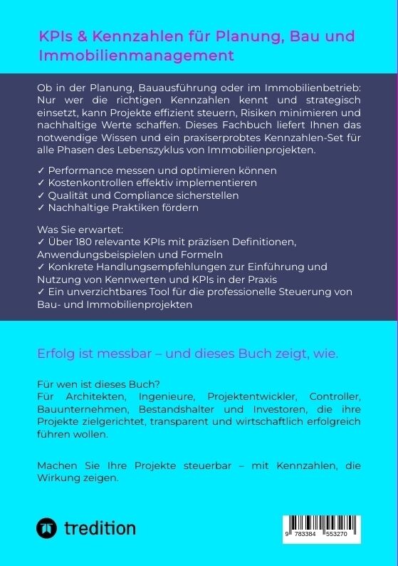 Dieses Buch bietet eine umfassende und praxisnahe Sammlung von über 180 KPIs und Kennzahlen für die Planung, Bauausführung und das Immobilienmanagement. Es zeigt, wie Kennzahlen strategisch eingesetzt werden können, um Bauprojekte effizienter zu steuern, Koste...