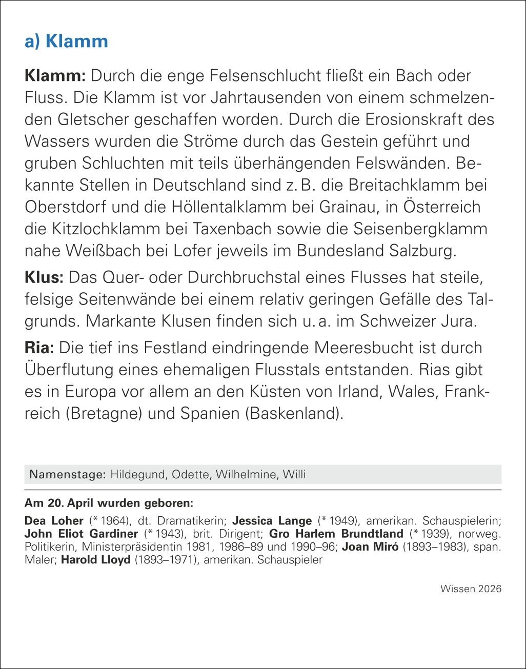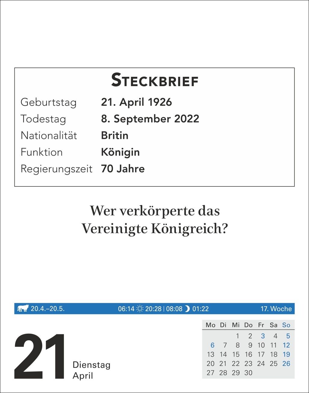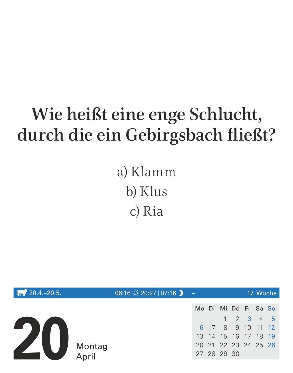 Jeden Tag ein bisschen schlauer: Unser Wissenskalender mit spannenden Fragen aus allen wichtigen Bereichen - Welche Antwort ist richtig? Was passt nicht dazu? Welche Worte fehlen im Text? Täglich andere Rätsel lösen und spielerisch die grauen Zellen trainier...